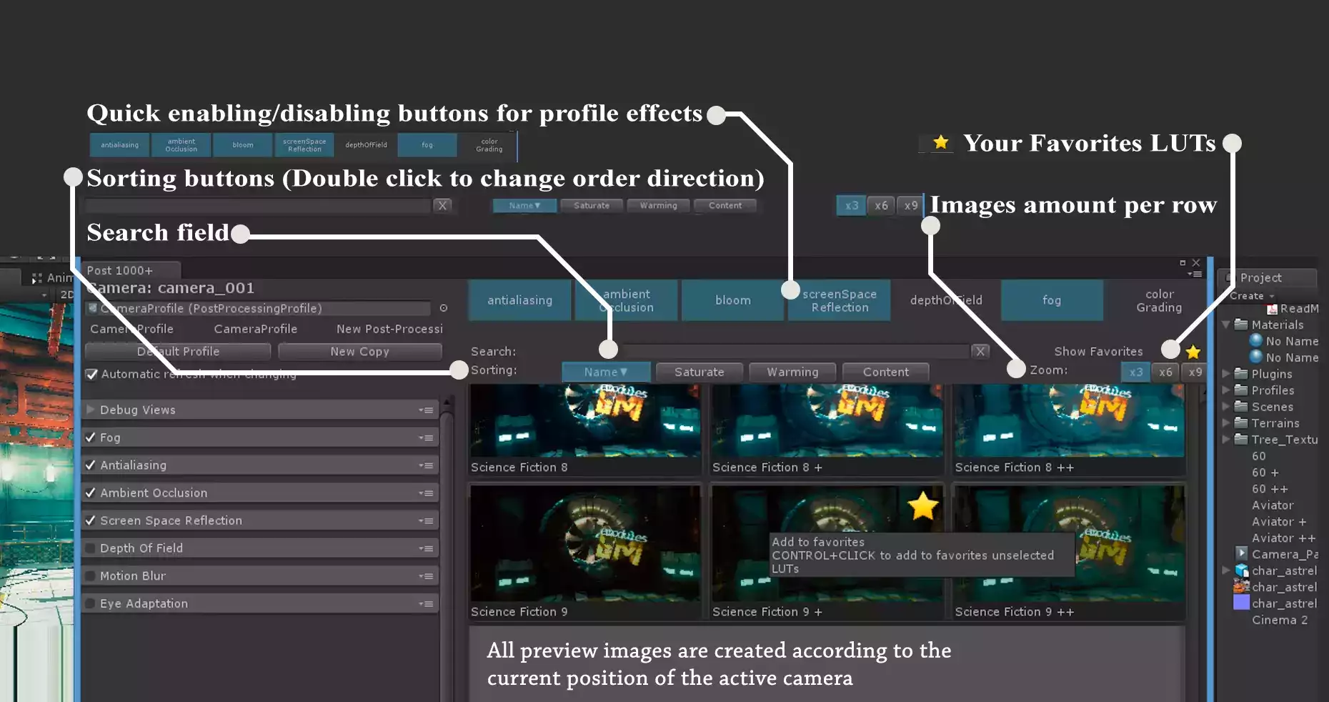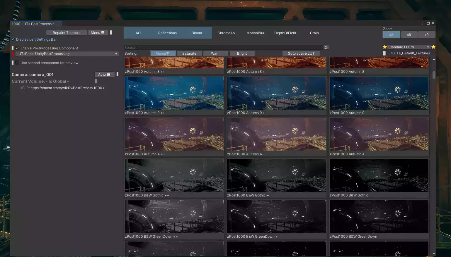 ℹ ️ Удобное окно настроек позволяет управлять интерфейсами плагинов постобработки (такими как Unity PostProcessing Stack), избранным, пользовательскими LUT, возможностью упорядочивания по сходству или по нагреву, насыщенности или содержимому, поиском, масштабированием, возможностью использования различных сценариев постобработки