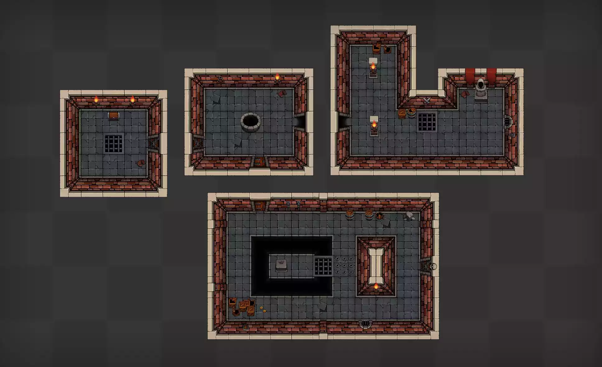 - Множество реквизита (128x128 пикселей - 256x256 пикселей): бочка, ящик, сундуки, горшок, статуя, баннер, факел (зажженный и неосвещенный) и многое другое