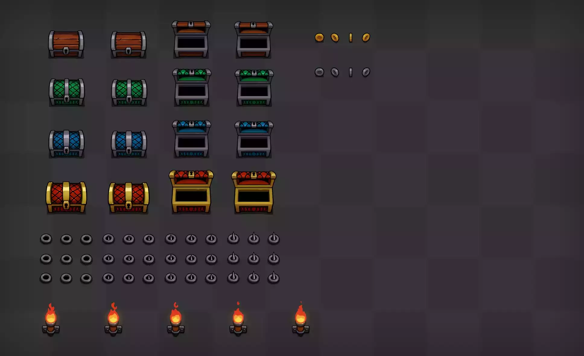 - Анимированный факел, сундуки, монета, ловушка с шипами