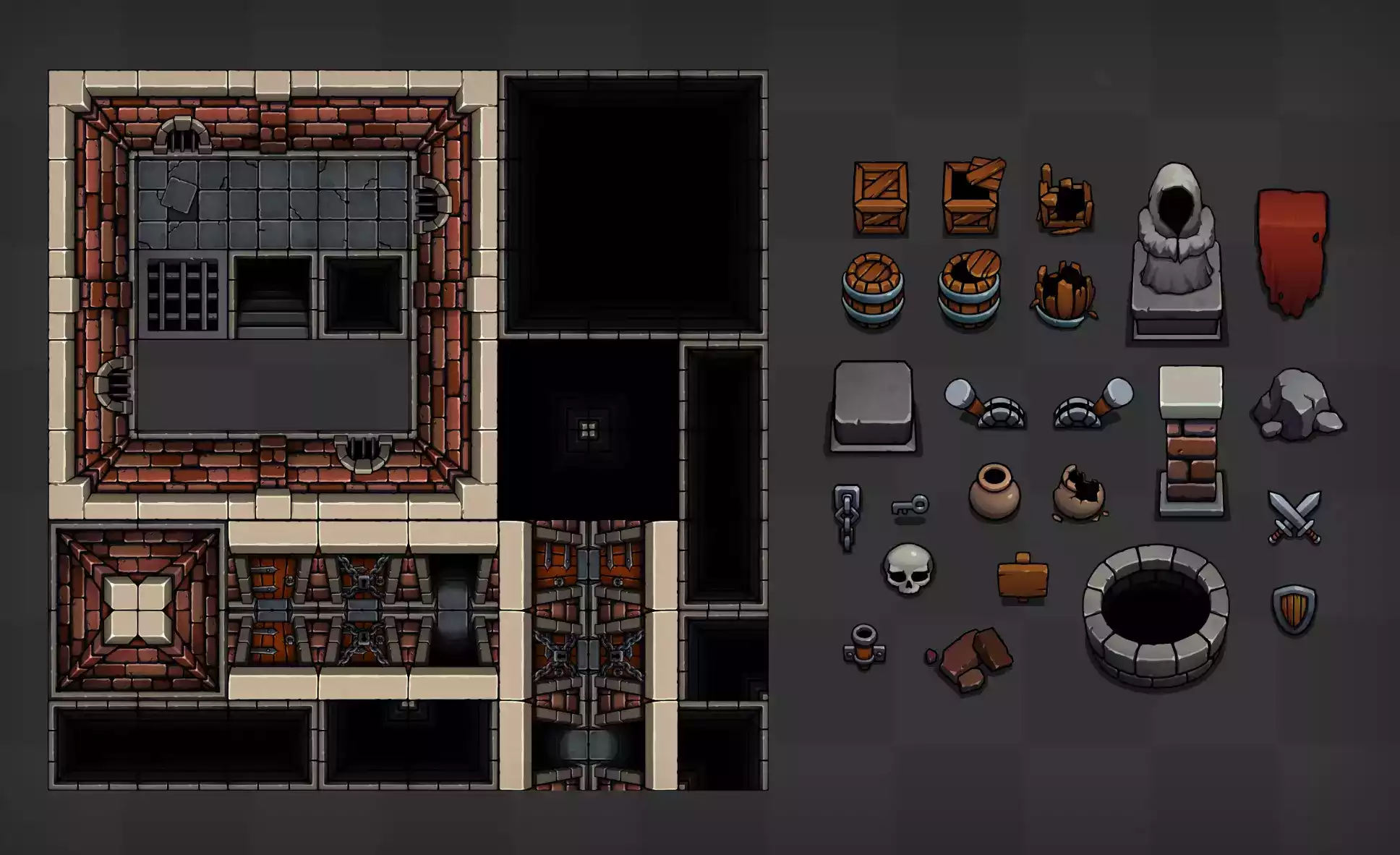 Набор плиток, которые можно использовать для создания игр "сверху вниз". Очень подходит для создания игр, похожих на roguelike, или других нисходящих игр с аналогичной тематикой.