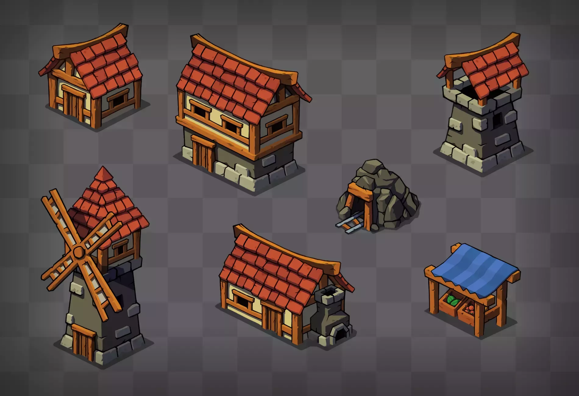 - Здания: ветряные мельницы, кузница, шахта, 2 дома, рынок, башня.