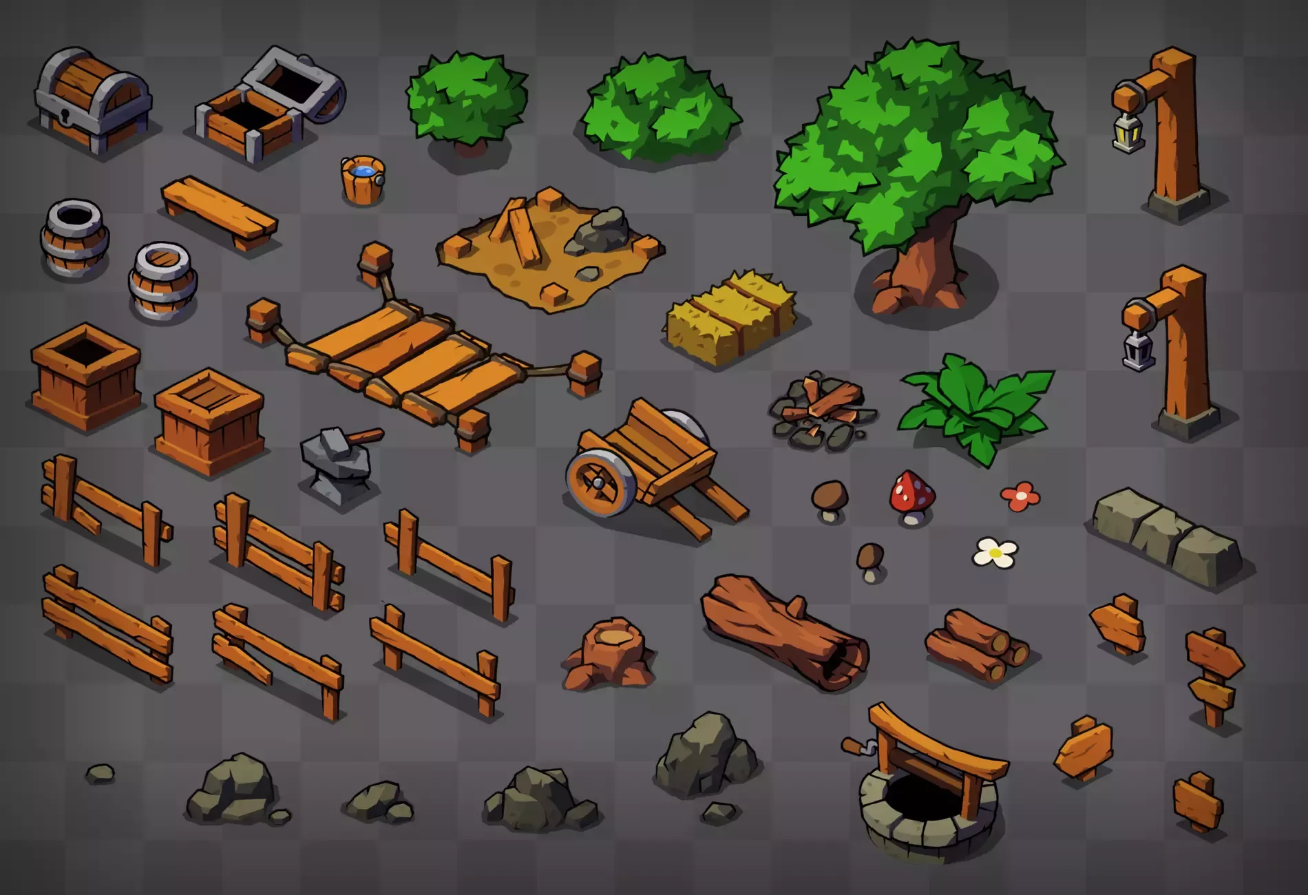Набор плиток и реквизита, которые можно использовать для создания изометрических игр.