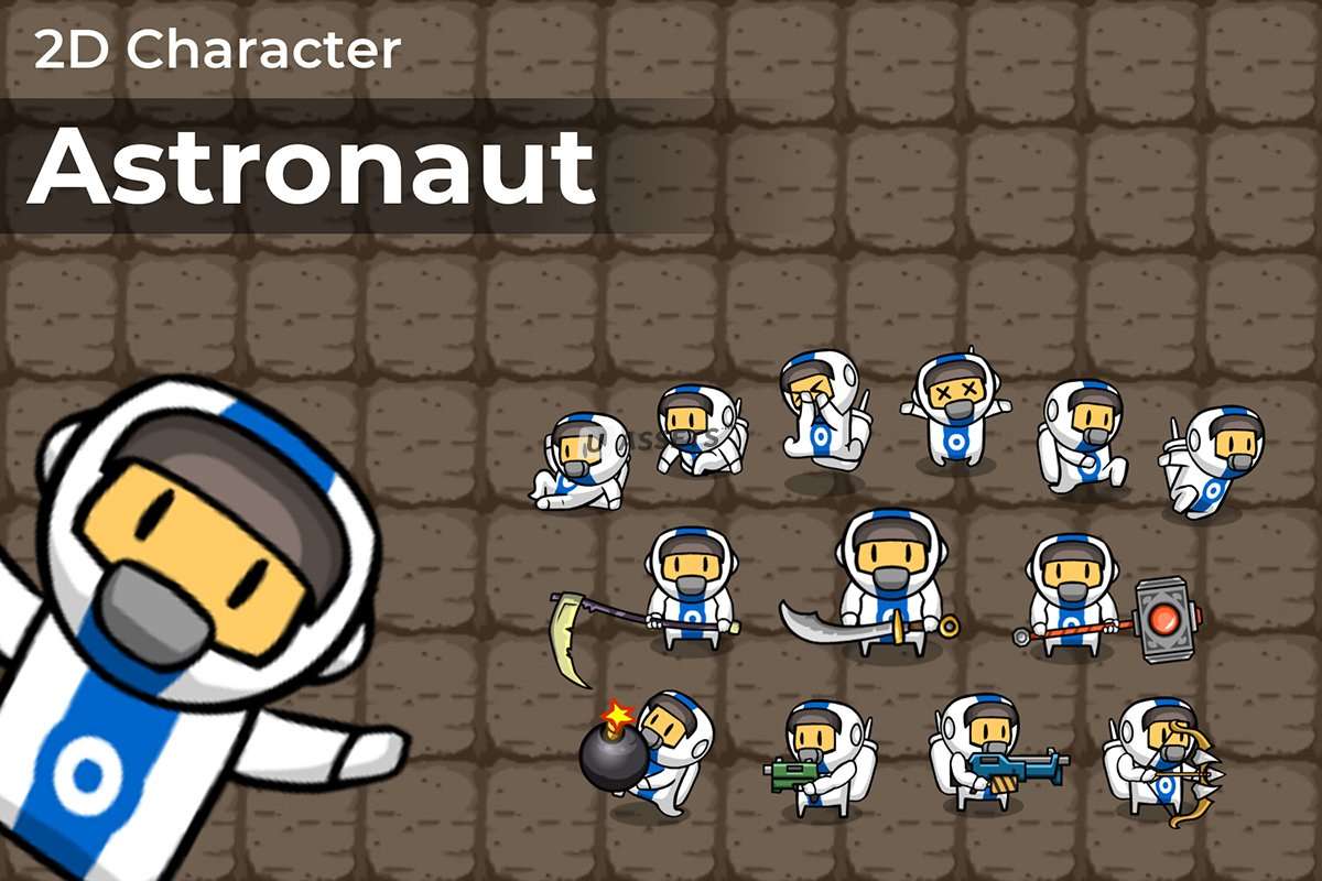 Этот пакет содержит 934 спрайта 2D-персонажа, который подходит для игр с видом сверху и боковой прокруткой. Он также поставляется с 174 спрайтами оружия и 191 спрайтом мира, что в сумме составляет 1299 спрайтов. Размер текстуры персонажа 450x430, включая безопасный кадр анимации. Реальное разрешение персонажа составляет примерно 135x180 (в зависимости от кадра анимации).