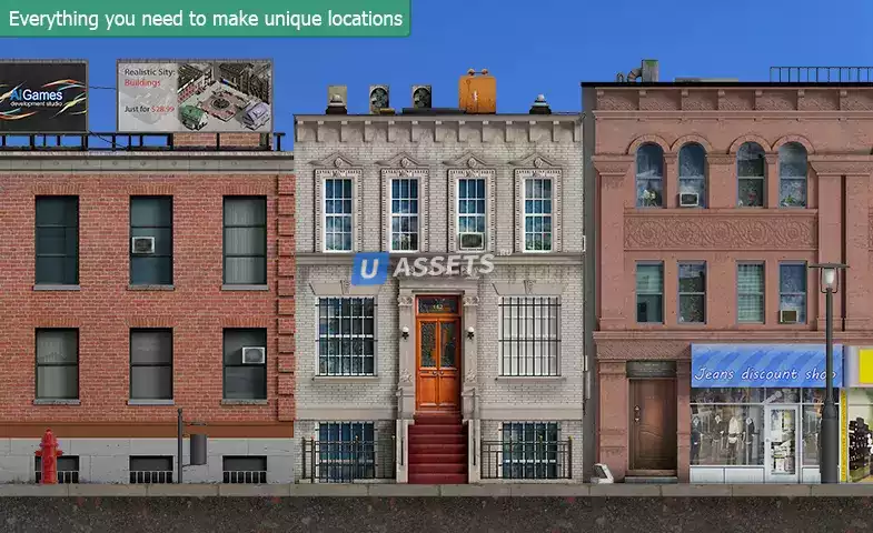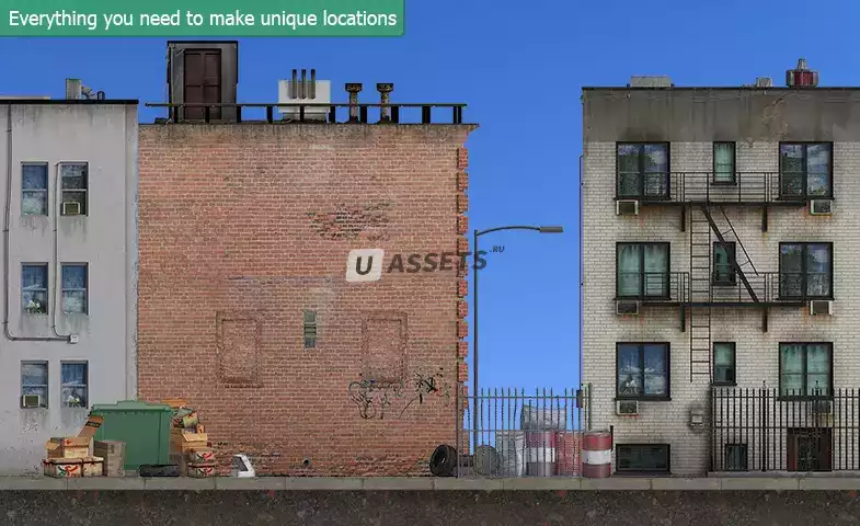 - Различные типы реквизита (185 спрайтов), чтобы сделать каждую часть вашего уровня уникальной: скамейки, клумбы, автобусные остановки, часы, банкомат, переменные дорожные знаки, уличные фонари, стенды, баннеры, телефон, мусорные баки и, конечно же, мусор. как картонные коробки, шины и бочки.