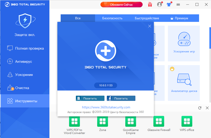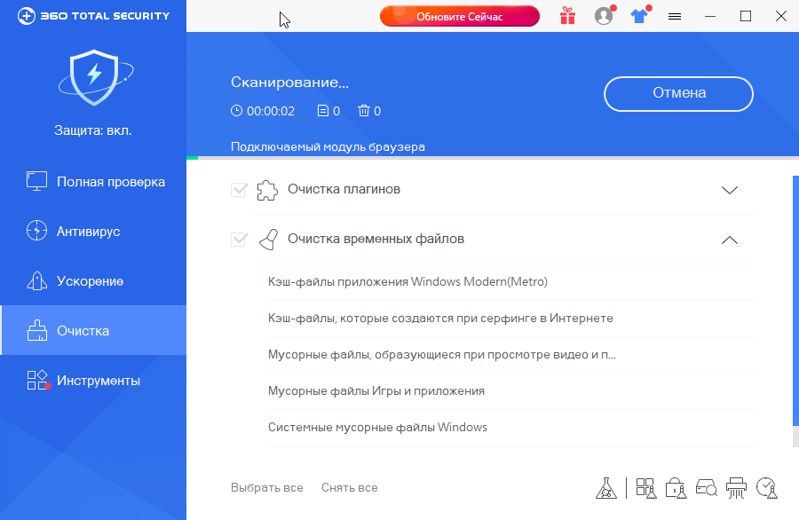 360 Total Security - это бесплатное программное обеспечение, которое защищает ваш компьютер от вирусов и других офлайн и онлайн-угроз. 360 Total Security обеспечивает эффективную защиту при загрузке файлов из неизвестных источников, просмотре веб-сайтов и при выполнении различных финансовых операций в сети (например, покупки на различных веб сайтах).