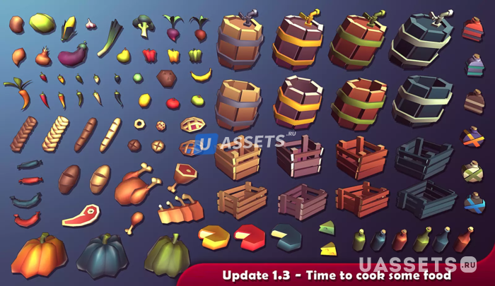 Овощи, Хлебобулочные изделия, Мясо, Фрукты, Бутылки, Сыры, Бочки, Ящики.