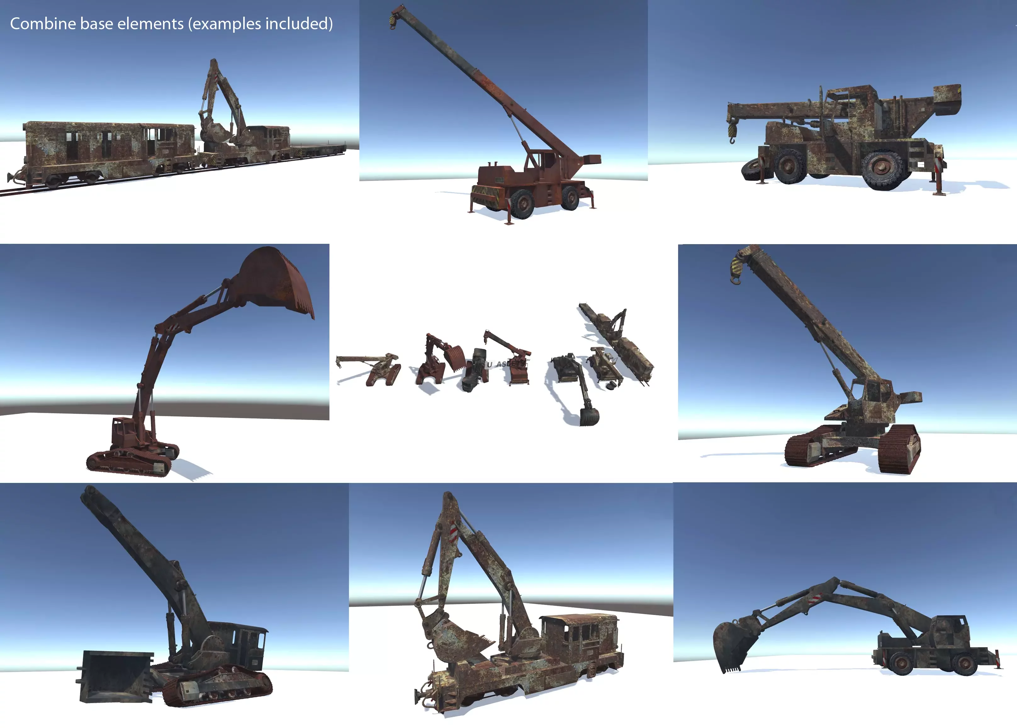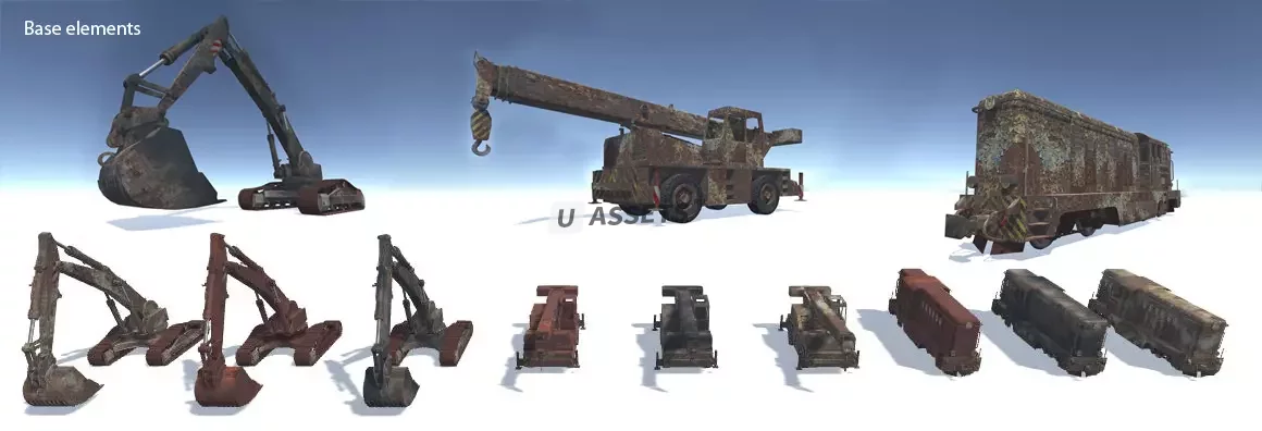 Это высококачественный пакет, содержащий старые транспортные средства, идеально подходящий для заселения заброшенных промышленных объектов. Все транспортные средства имеют 3 варианта диффузной текстуры - либо используйте базовые модели, либо начните создавать свои собственные, комбинируя и настраивая различные базовые элементы! (включая сводную иерархию)