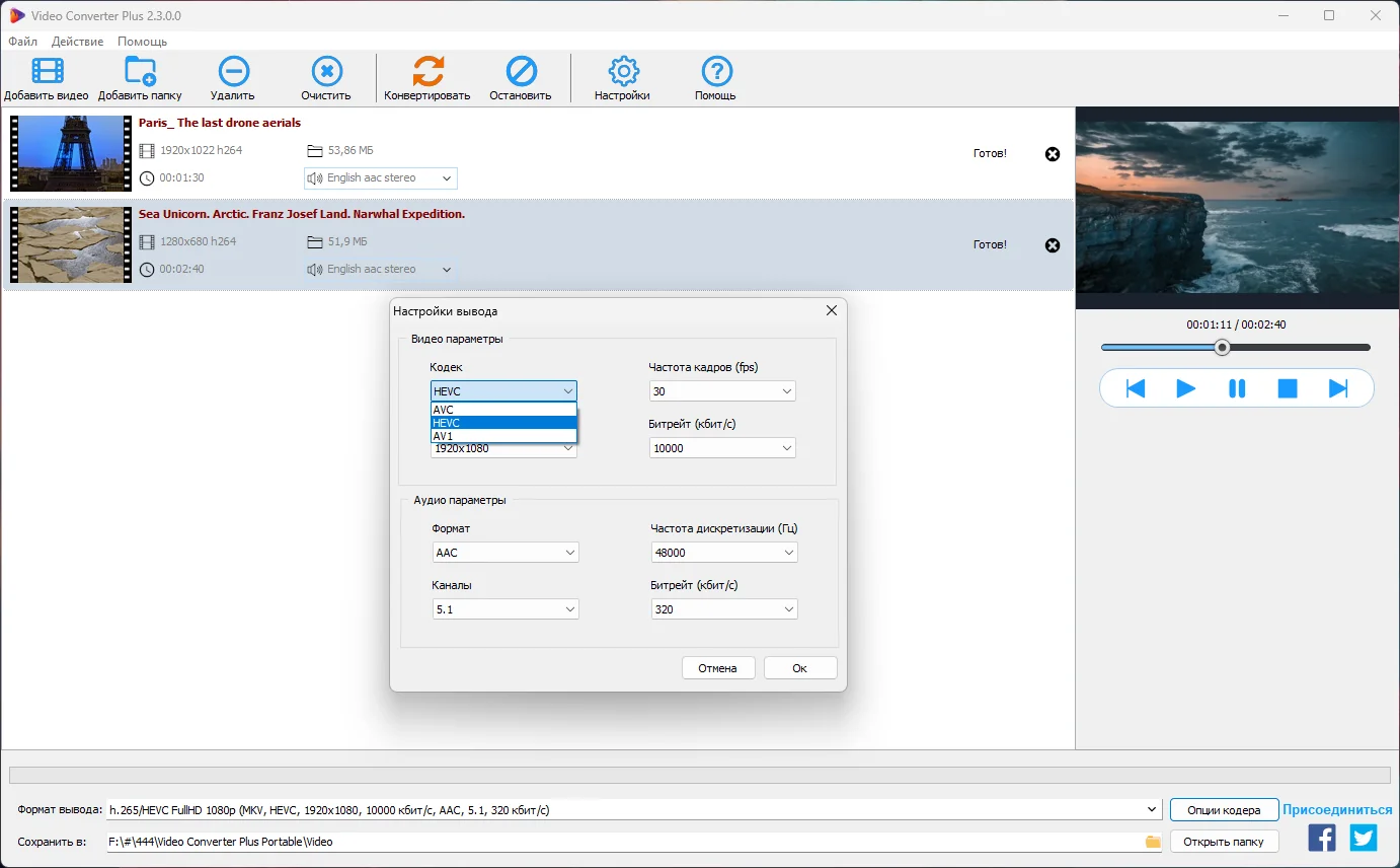 - Поддержка современных форматов: Программа фокусируется на актуальных и широко поддерживаемых форматах, таких как h.264/AVC, h.265/HEVC и новейший AV1. Такой подход обеспечивает совместимость с большинством современных устройств — от смартфонов до телевизоров — без необходимости установки дополнительного программного обеспечения и с минимальным потреблением энергии.