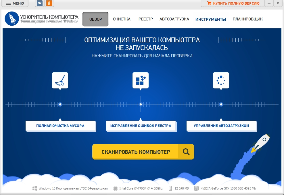 Интерфейс программы достаточно простой, в верхней части разместились основные кнопки навигации, обзор, очистка диска, реестр, автозагрузка, инструменты, планировщик. В первой вкладке “Обзор” мы можем увидеть три основных инструмента которые позволяют сразу получить прирост производительности, это полная очистка жесткого диска от мусора, исправление ошибок реестра и гибкая настройка автозагрузки, после выполнения этих задач требуется перезагрузка.