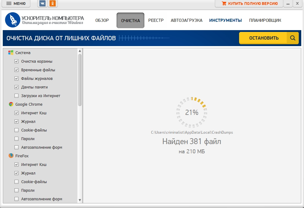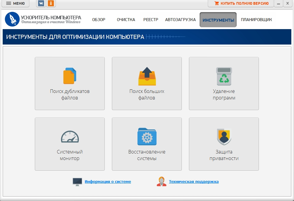 Именно для таких случаев разработали программу “Ускоритель компьютера”, программа позволяет производить оптимизацию операционной системы, реестра, и “удаляет мусорные файлы” за пару кликов мыши, и не требуется навыков и определенных знаний. Кроме того, является отличным инструментом для удаление ненужных программ, редактирование автозагрузки, и поиска дубликатов файлов.