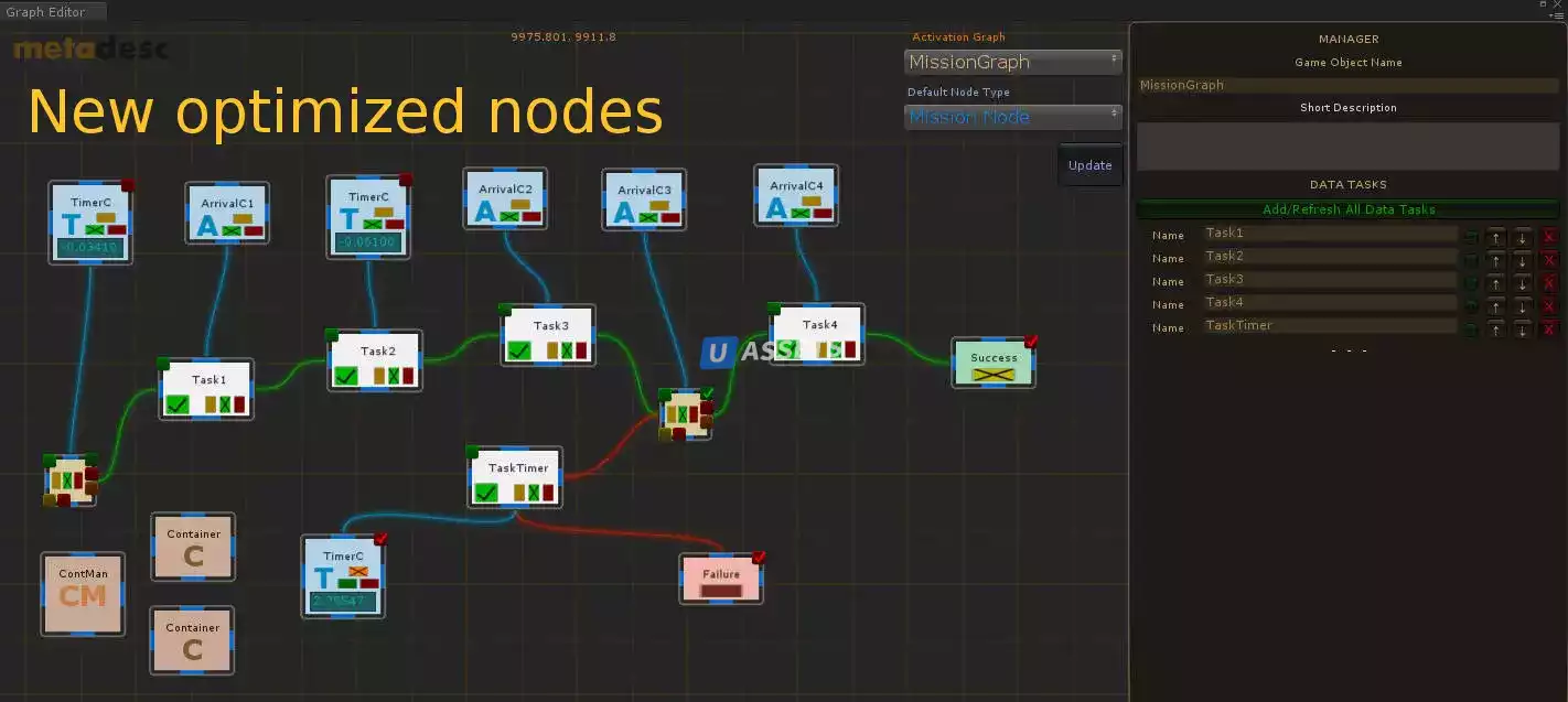 В системе Activation Graph вы можете создать систему узлов, например. система миссий, система исследований, система сборки, система крафта и многое другое. Он также может служить редактором временной шкалы. Все эти различные типы узлов на графиках могут быть связаны друг с другом, например. вы можете связать задачу миссии с задачей исследования. Я разработал эту графическую систему для своего потока миссий, но она настолько мощная, что я уже использую ее для своего дерева технологий и дерева сборки. Система Activation Graph не генерирует никакого кода в фоновом режиме, она создает экземпляры GameObjects с помощью определенного сценария узла, который можно настроить.