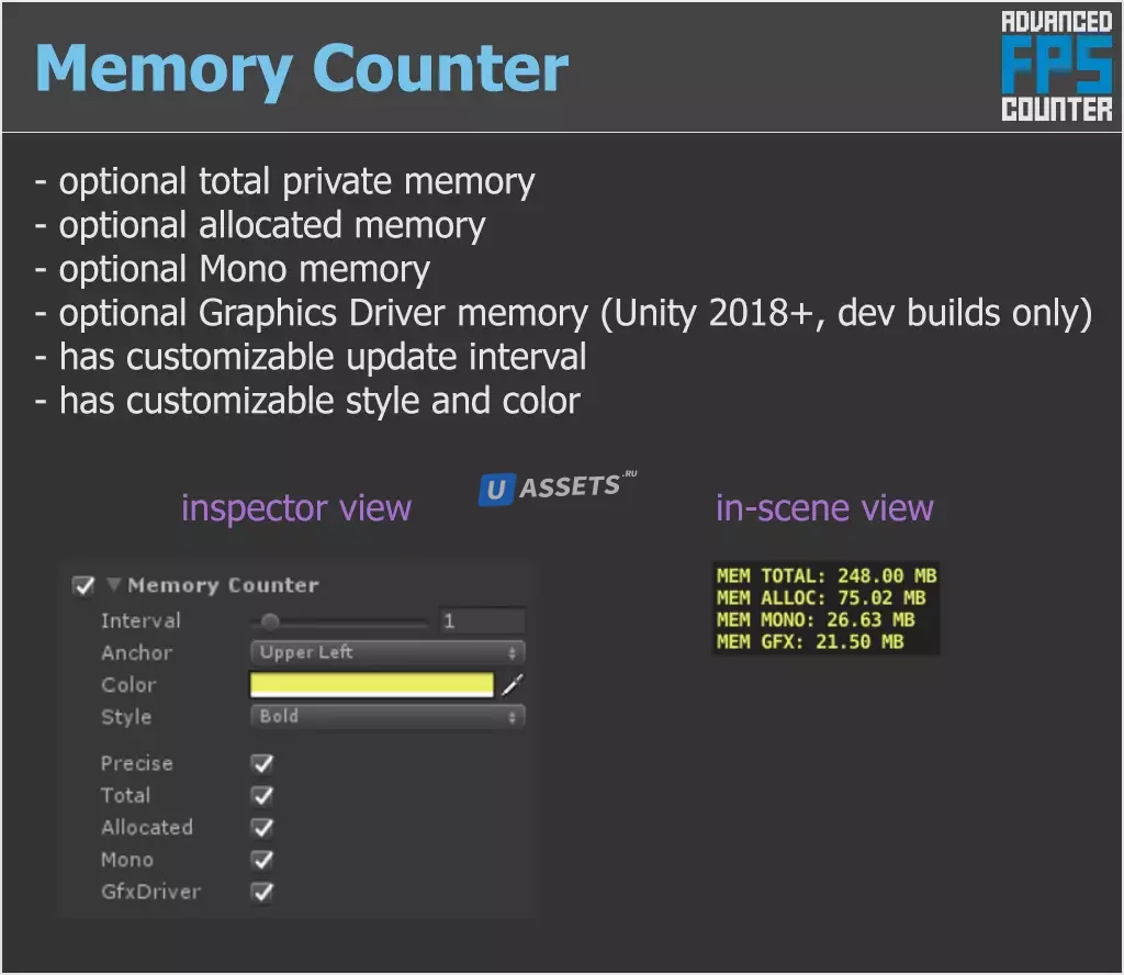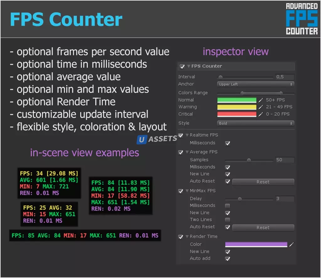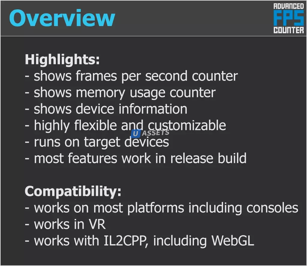 Простой и гибкий внутриигровой счетчик кадров в секунду с расширенными функциями, позволяющий отслеживать статистику вашей игры прямо на целевом устройстве. Дружелюбны как художники, так и разработчики!