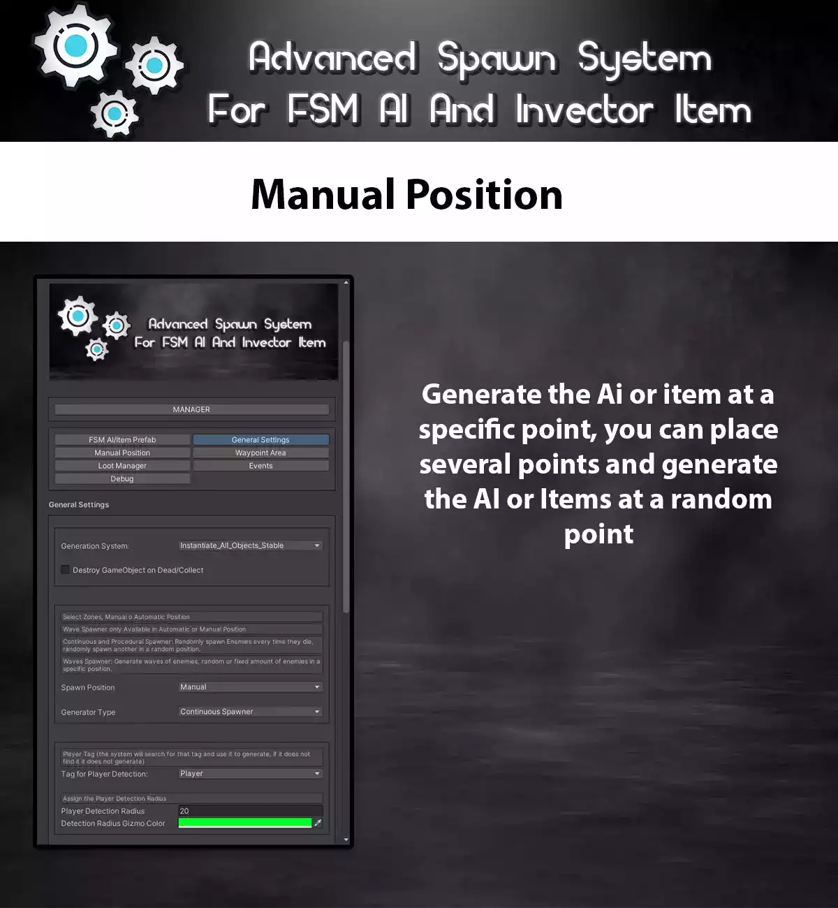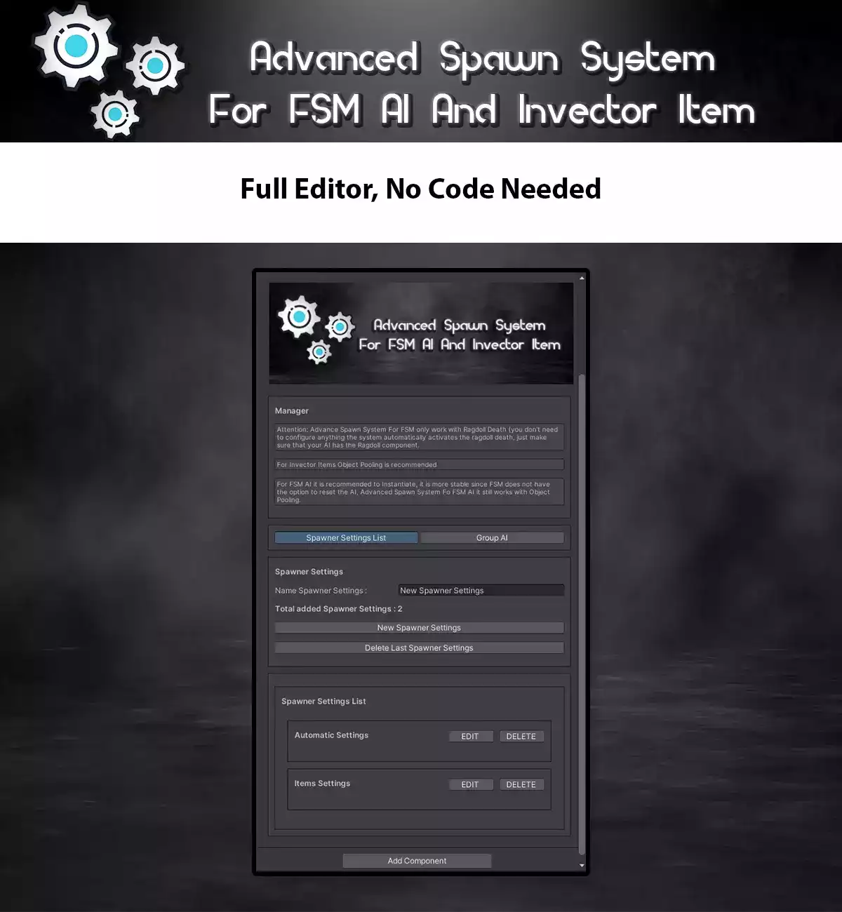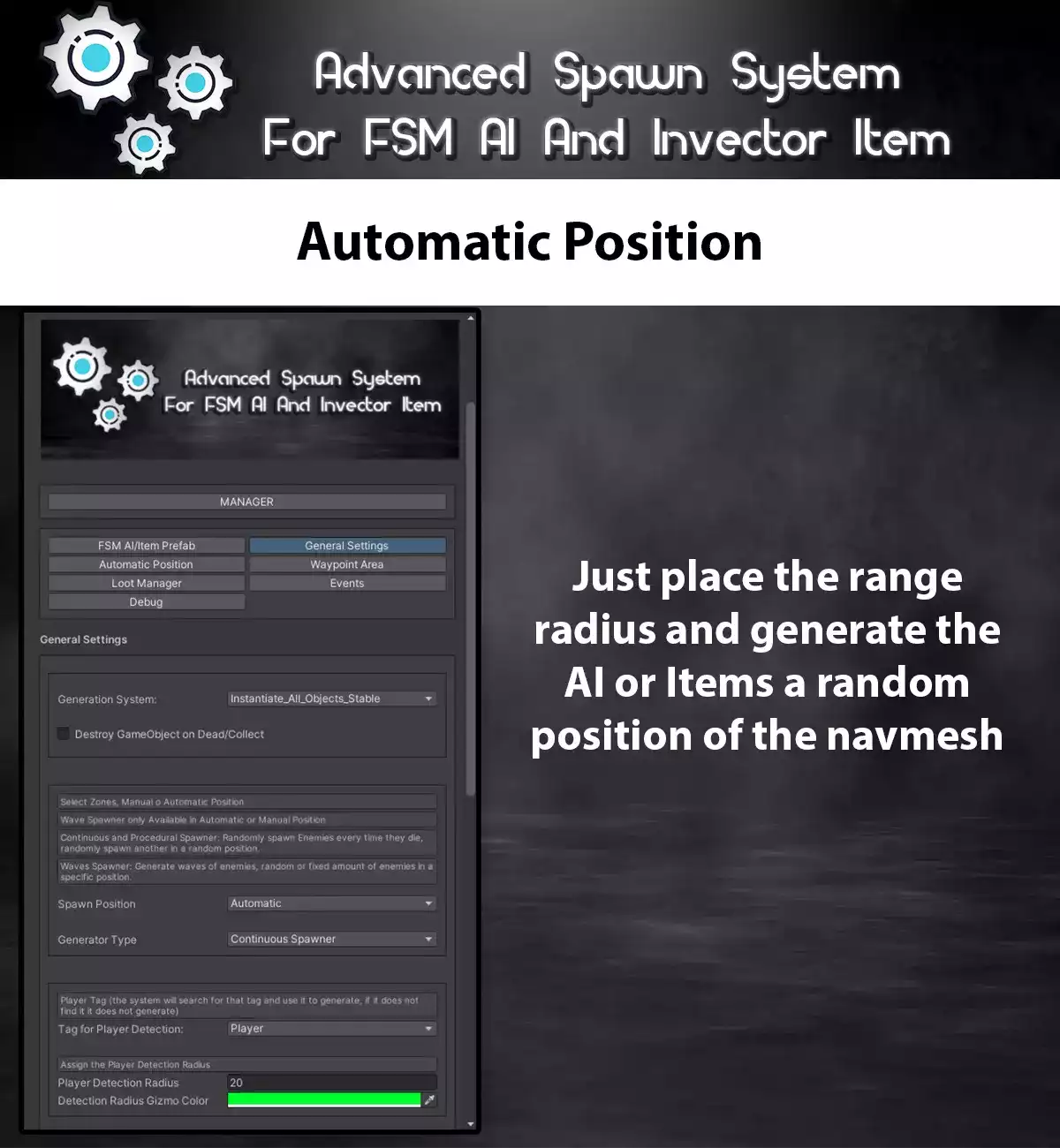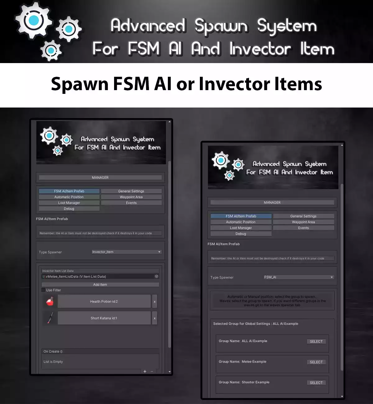 Усовершенствованная система появления для FSM AI и Invector Item обеспечивает простое и мощное решение для всех потребностей в появлении врагов или предметов. В нем есть полностью настраиваемые области появления с точным обходом препятствий и даже появлением навигационной сетки!