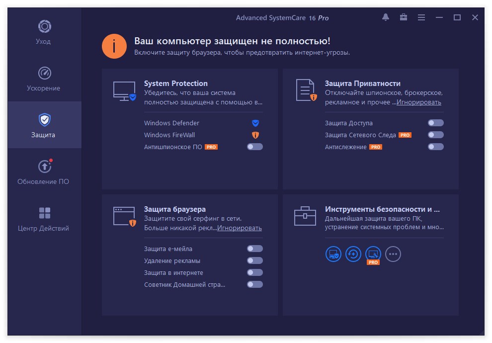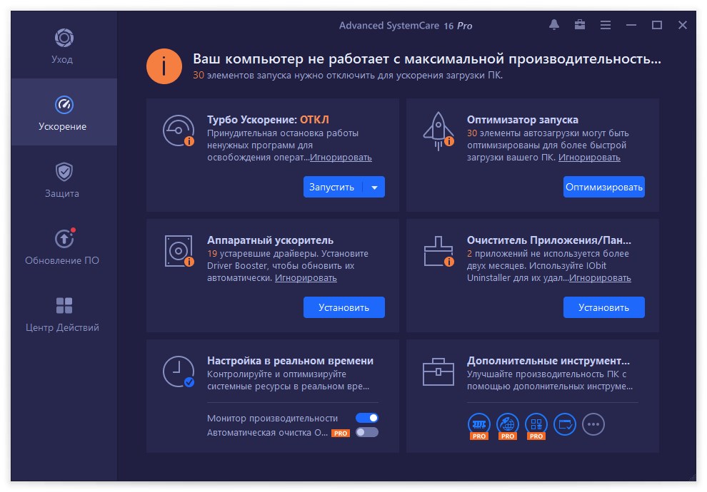 Более продвинутым пользователям следует заглянуть на вкладку «Инструменты», где есть дополнительные опции. Благодаря им возможно удаление программ и их мусора, «умная» дефрагментация диска, проверка целостности раздела, восстановление ошибочно удаленных данных, а также уничтожение файлов без возможности восстановления. В Advanced SystemCare большинство описанных опций доступны бесплатно, но функции, которые помечены как PRO, доступны только в платной версии.