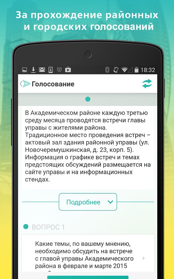 Каждую неделю мэр и правительство Москвы выносят на обсуждение в приложении различные темы: от благоустройства дворов и улиц до культурных и транспортных инициатив. Указав свои адреса, пользователи получают доступ к опросам окружного и районного значения, что делает участие максимально релевантным.