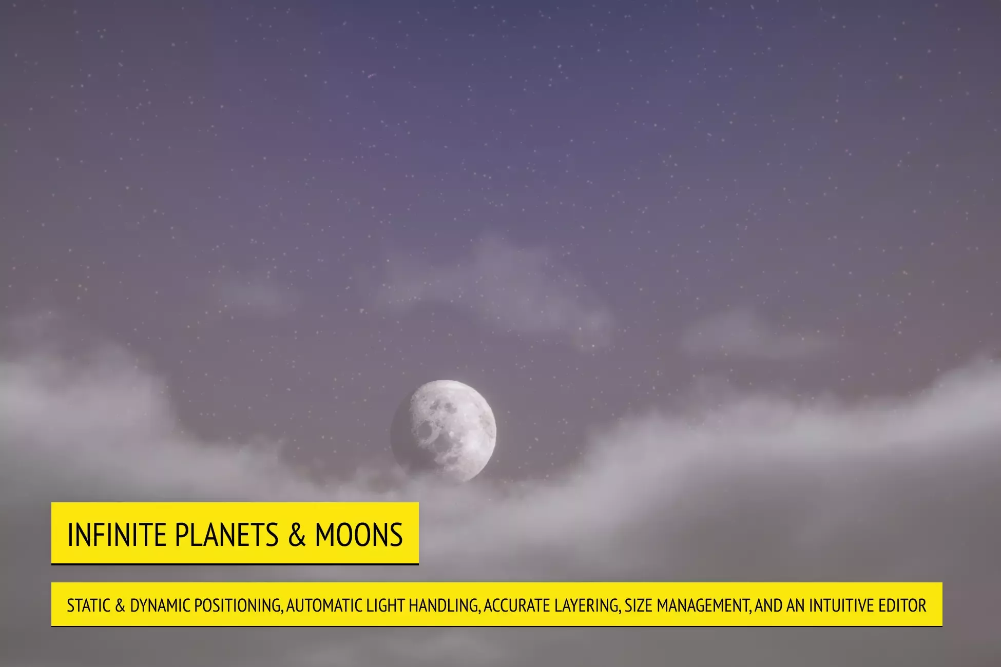 Наш пакет skybox представляет собой процедурное небо с динамическим освещением. Расслабьтесь и наблюдайте за анимированными облаками, небом, солнцами, лунами и звездами, движущимися над головой.