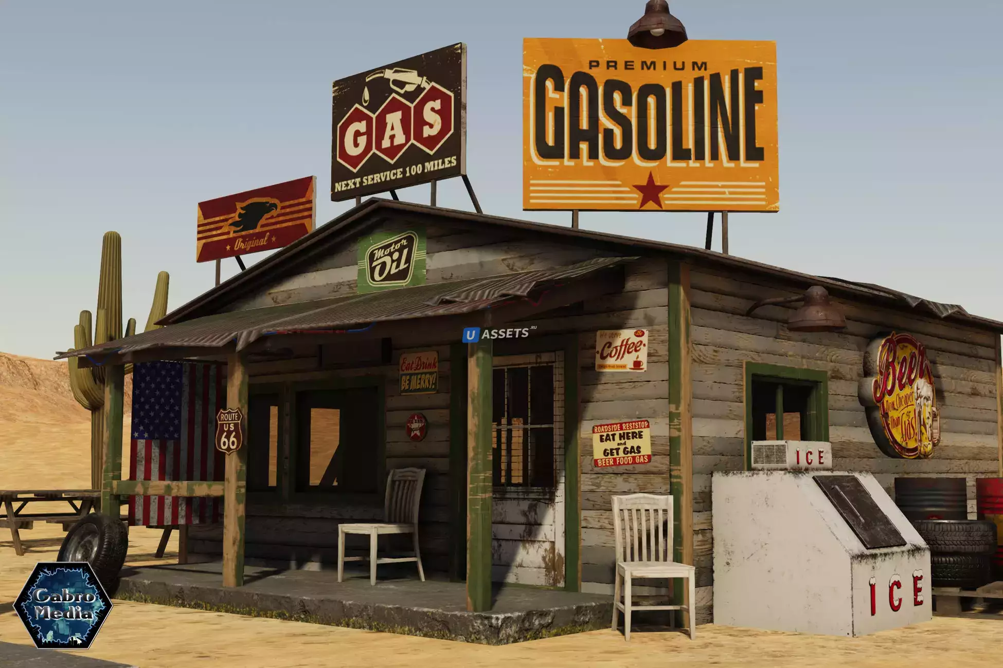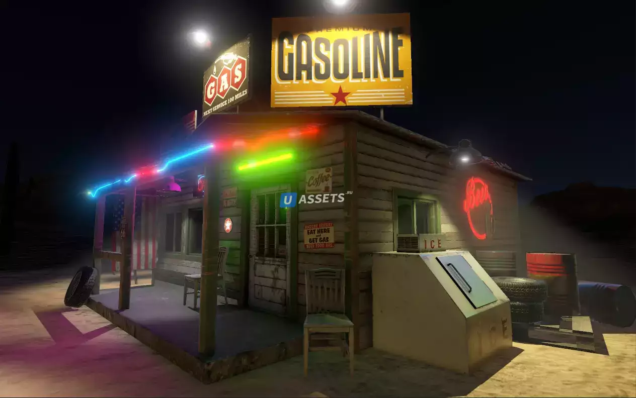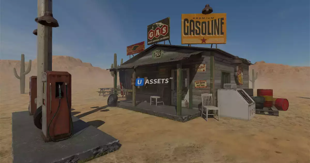 Традиционная, старая американская модель здания автозаправочной станции, которая имеет как интерьер, так и экстерьер. Внутри нет мебели, но все, что вы видите на скриншоте, включено в пакет активов, всего 27 моделей.
