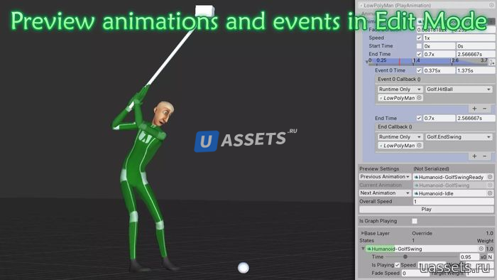 ❸ Пользовательские события -> Регистрируйте обратные вызовы событий, которые будут запускаться в определенное время во время анимации без проблем, связанных с обычными анимационными событиями Unity.