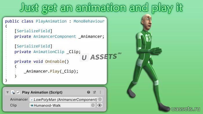 Animancer позволяет воспроизводить анимации по требованию и контролировать все их детали без каких-либо дополнительных шагов по настройке. Он решает основные проблемы с контроллерами аниматоров и может либо полностью заменить их, либо работать вместе с ними. Это значительно облегчает работу с анимациями на всех этапах разработки, начиная с базового прототипирования и заканчивая обслуживанием и отладкой сложных систем.