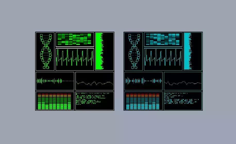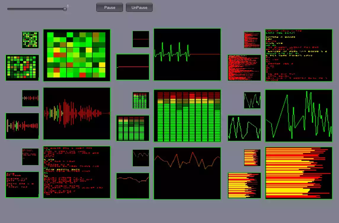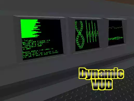 Динамический VDU - это набор анимированных динамических мониторов, которые будут показывать диапазон бдительности от отсутствия тревоги - все горит зеленым цветом до полной готовности - большинство горит красным.