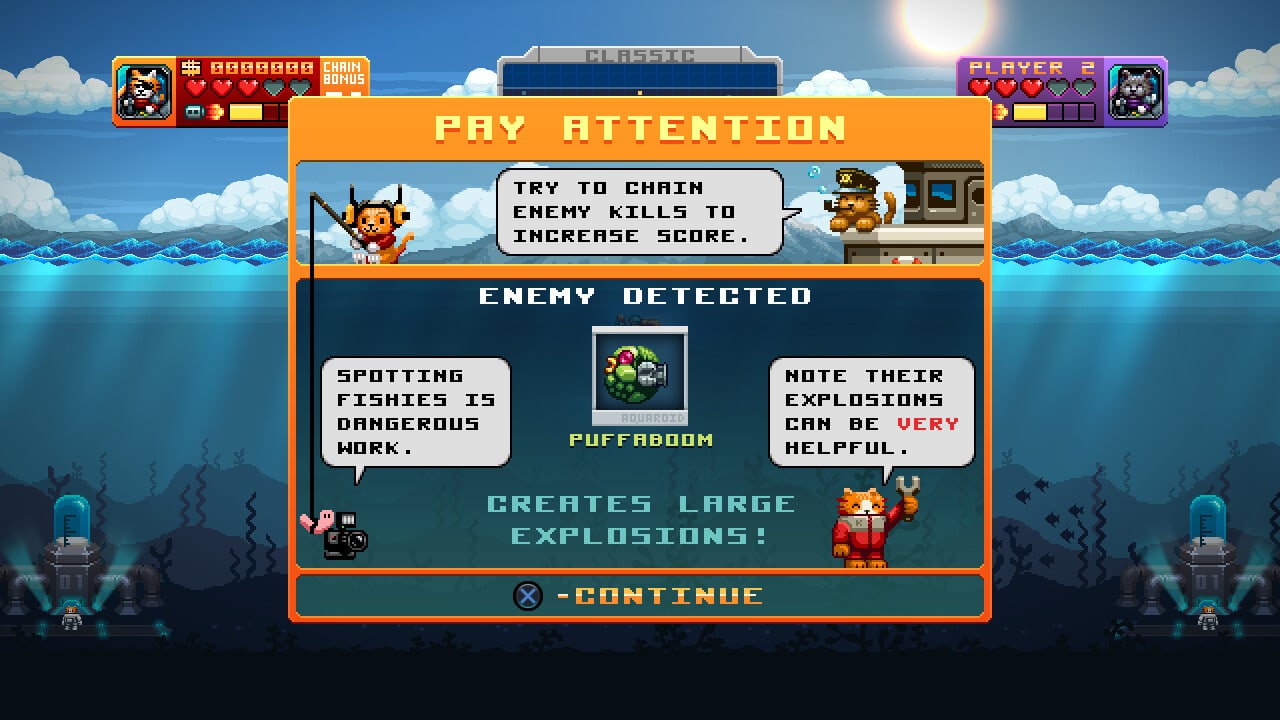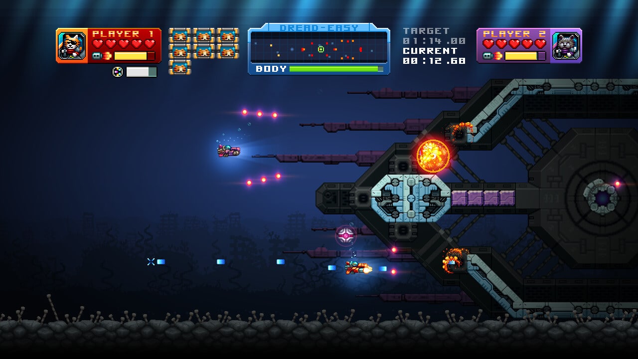 В Arcade-режиме, уничтожая врагов, вы собираете драгоценные кристаллы для покупки постоянных улучшений, которые остаются с вами на протяжении всей игры. Для любителей настоящего экшена в AQUA KITTY UDX есть режим «Дредноут», где вы будете противостоять гигантским многопалубным кораблям. Чтобы победить, нужно тактично разрушать их узлы, находить уязвимые точки и в финале уничтожить энергетическое ядро, попутно освобождая пленных собратьев. Игра AQUA KITTY UDX — это не только обновленная визуальная составляющая с параллаксными небесами и отполированными эффектами, но и отточенный, сбалансированный геймплей для максимально плавного и увлекательного прохождения.