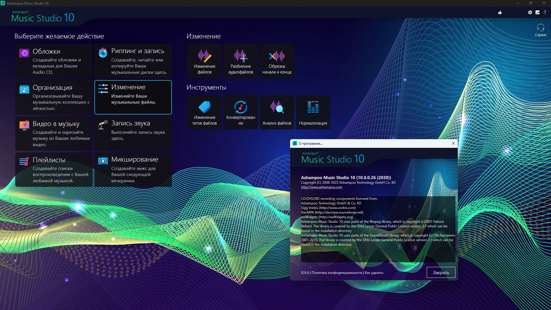 Программа предлагает восемь специализированных модулей, охватывающих все основные задачи: от точного редактирования дорожек и нарезки аудио до записи дисков. Ashampoo Music Studio 10.0.0.26 Portable by Жека сочетает простоту использования с высокой функциональностью, позволяя с минимальными усилиями управлять всей музыкальной коллекцией.