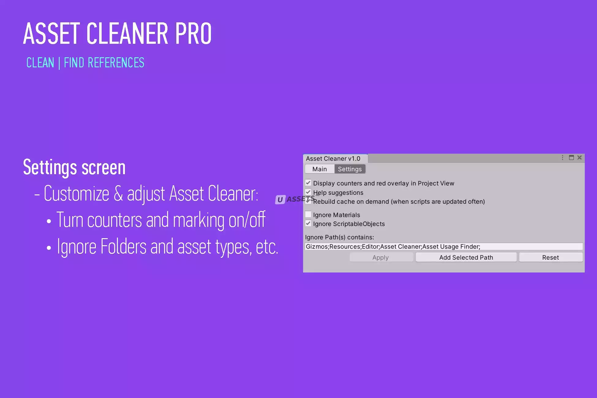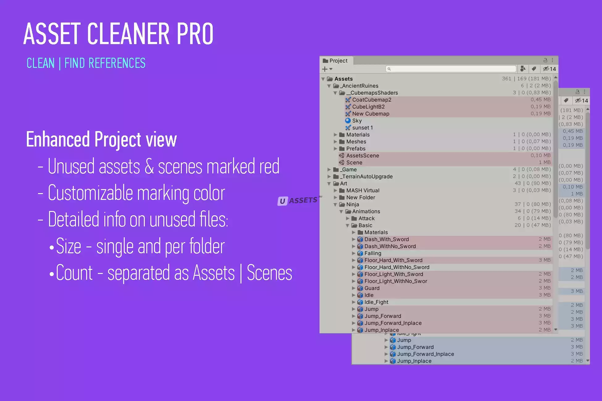 - Счетчики неиспользуемых ресурсов и сцен в папках