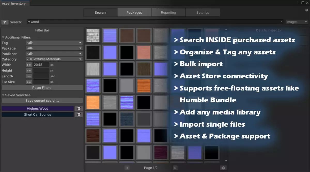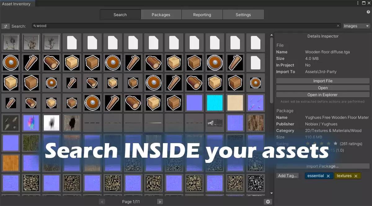 Ваша полная библиотека активов: Автоматически индексирует покупки в магазине активов. Запускает загрузку отсутствующих активов. Обрабатывает пакеты из реестров. Поддерживает пользовательские папки для поиска по пакетам Unity, загруженным из других мест. Индексирует папки и Zip-архивы, содержащие произвольные медиафайлы, такие как 3D-модели, аудиотеки, текстуры и многое другое. Автоматически генерирует предварительные просмотры.