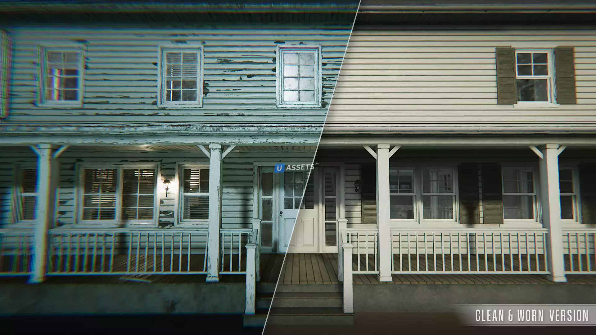 - Основные материалы дома поддаются настройке; более или менее изношенный вид. (Шейдер доступен только в HDRP и URP, а не во встроенном конвейере рендеринга.)