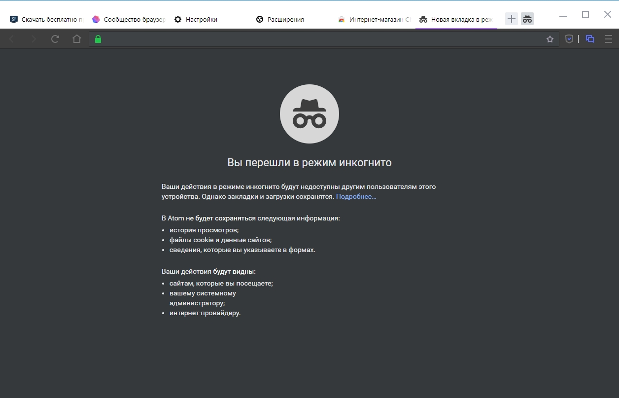 Выше я перечислил вещи, которые выделают Atom на общем фоне, но помимо этого в браузере присутствуют полезные инструменты, например, режим инкогнито, Ваши действия в режиме инкогнито будут недоступны другим пользователям этого устройства. Однако закладки и загрузки сохранятся.