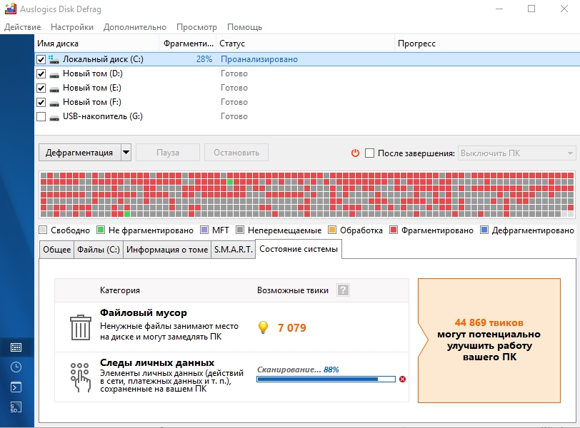 “Auslogics Disk Defrag” - Программа для качественной дефрагментации данных на жёстком диске компьютера, чтобы ускорить загрузку системы и сделать максимально быстрый доступ к файлам.