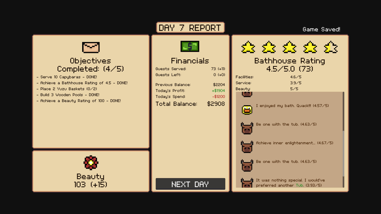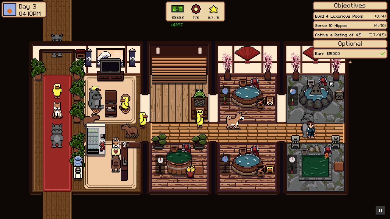 В игре Bathhouse Creatures вас ждет разнообразная клиентура: утки, капибары, бегемоты и другие существа, у каждого из которых есть своя предыстория. Обслуживая гостей, вы постепенно узнаете об их прошлом и проблемах, раскрывая короткие сюжетные линии, которые развиваются от визита к визиту. Уровень удовлетворенности посетителей напрямую зависит от обстановки в бане и конкретных предметов, которые вы разместите в помещениях. Если учесть предпочтения гостей, предложив им особые угощения или подобрав подходящий декор, можно получить дополнительные чаевые.