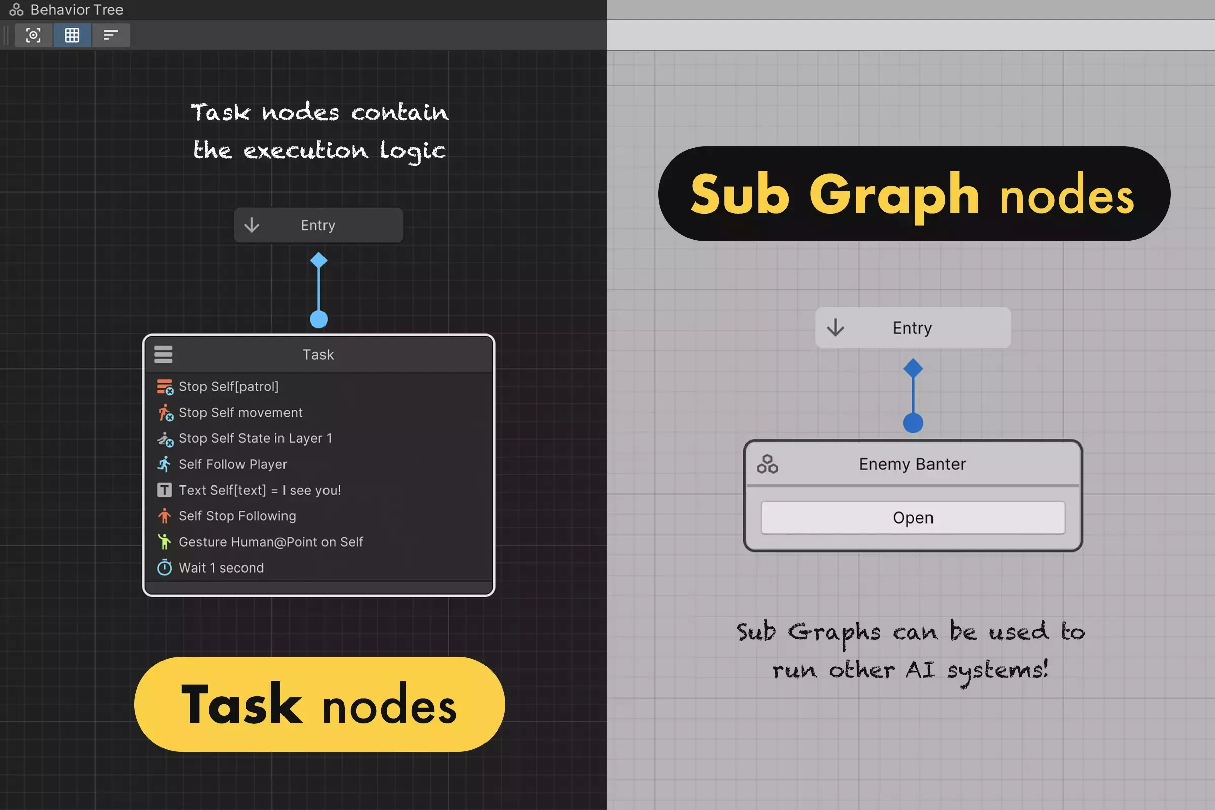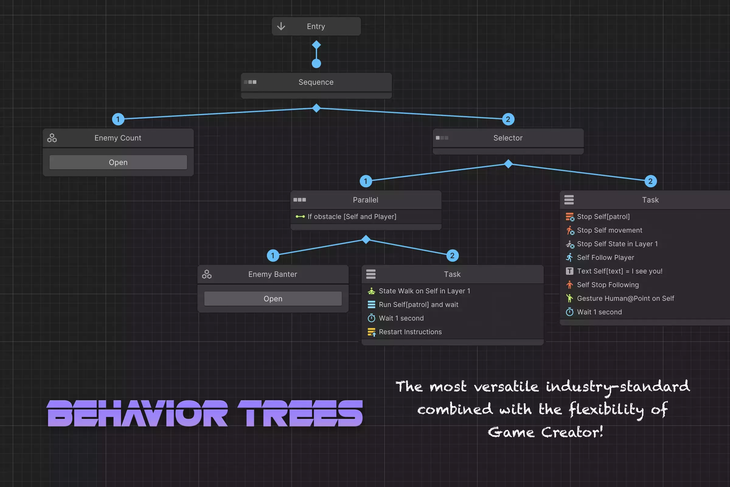 Деревья поведения позволяют сделать системы более организованными. В них присутствуют все распространенные типы узлов, такие как задачи и подграфы.