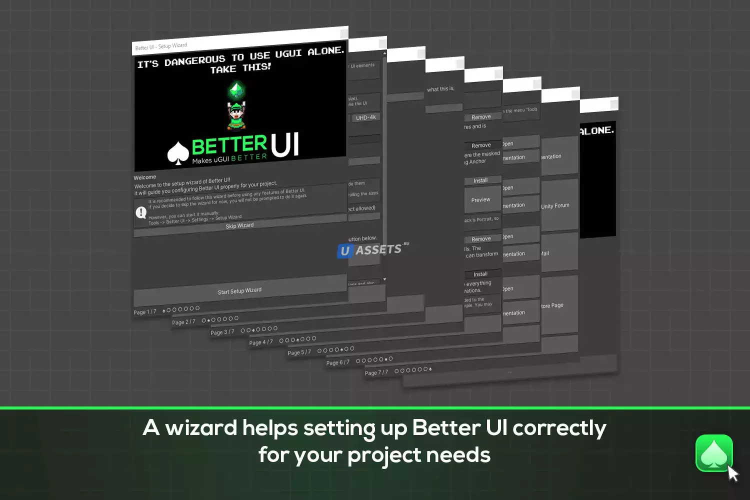 Создавайте пользовательские интерфейсы, работающие с любым разрешением. Используйте инструмент Привязки анкеров, чтобы легко правильно настроить анкеры. Используйте рабочий процесс "Make Better", чтобы преобразовать ваши компоненты в их версию "Better UI". Переменные, которые содержат размеры объекта (например, размер шрифта), изменяются в соответствии с разрешением - и у вас есть полный контроль над тем, как он настраивает такие значения размера.