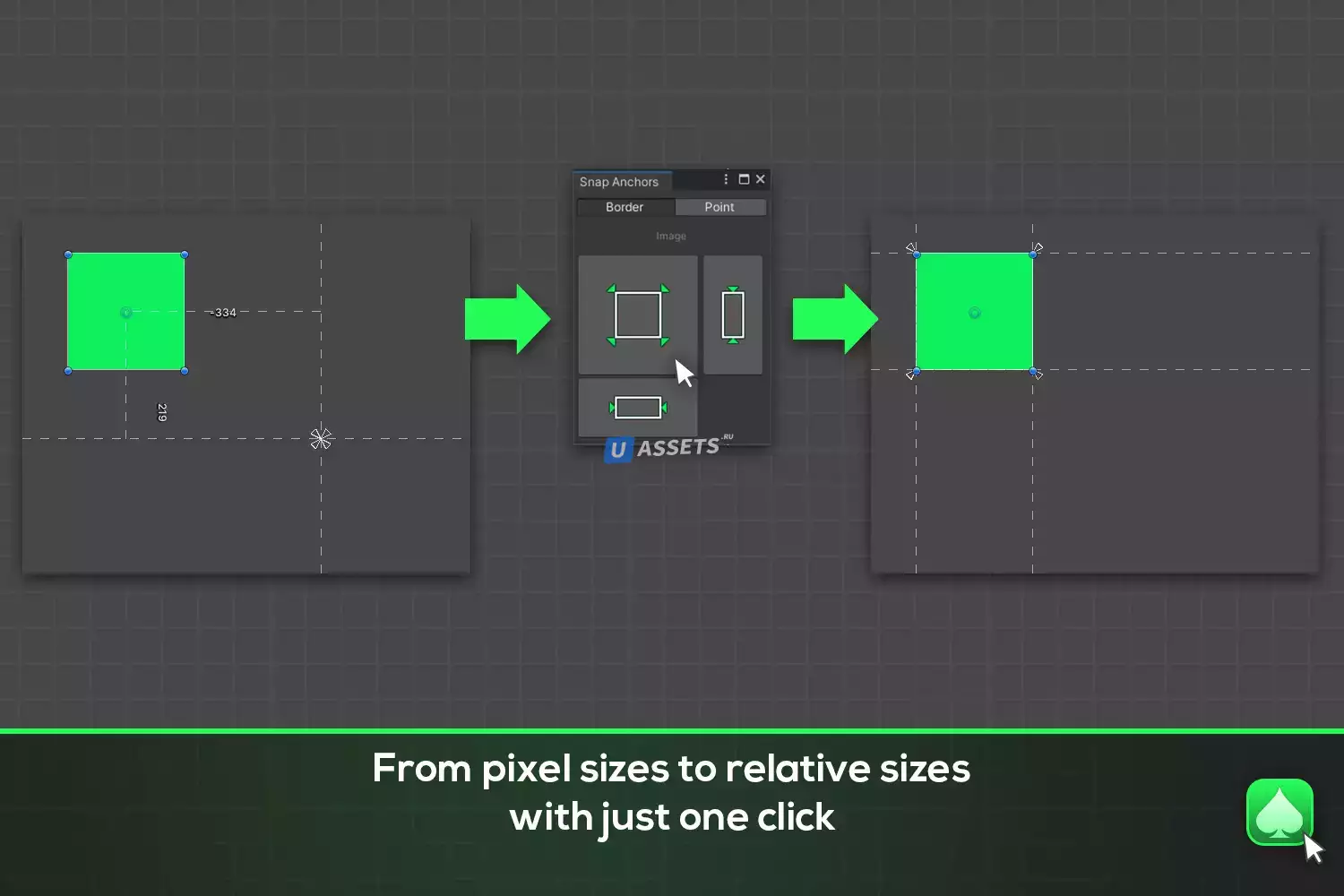 Средство настройки размера содержимого позволяет вам определить минимальный или максимальный размер, а также добавить отступы к размеру. У него также есть возможность проверить размер другого (дочернего) объекта в иерархии вместо самого себя. Все это, конечно, не зависит от разрешения и готово к адаптивному дизайну.