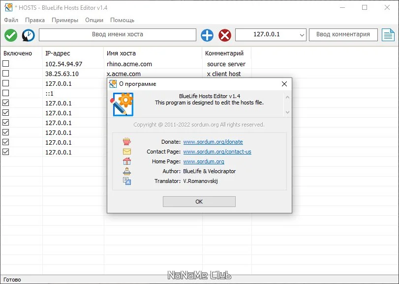 Программа отличается компактным размером и высокой скоростью работы. BlueLife Hosts Editor разработан компанией Sordum и распространяется бесплатно. Интерфейс утилиты прост и логичен, все основные инструменты для редактирования вынесены на видимые панели. Важным преимуществом для русскоязычных пользователей является наличие полной локализации программной оболочки.