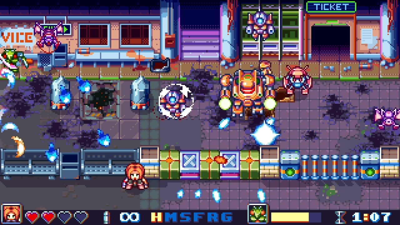 Bot Vice — это динамичный топ-даун шутер, где от игрока требуются отличная реакция и меткость. Геймплей этой игры напоминает оживлённый тир, полный летящих пуль, взрывов и механических противников. Вы берёте на себя роль Эрин Сэйвер и отправляетесь с ней в опасное путешествие, чтобы поквитаться с коварной бандой Дикоботов. Игра Bot Vice отличается высокой скоростью и напряжённым действием, вдохновляясь классическими аркадными проектами 90-х, такими как Mega Man X.