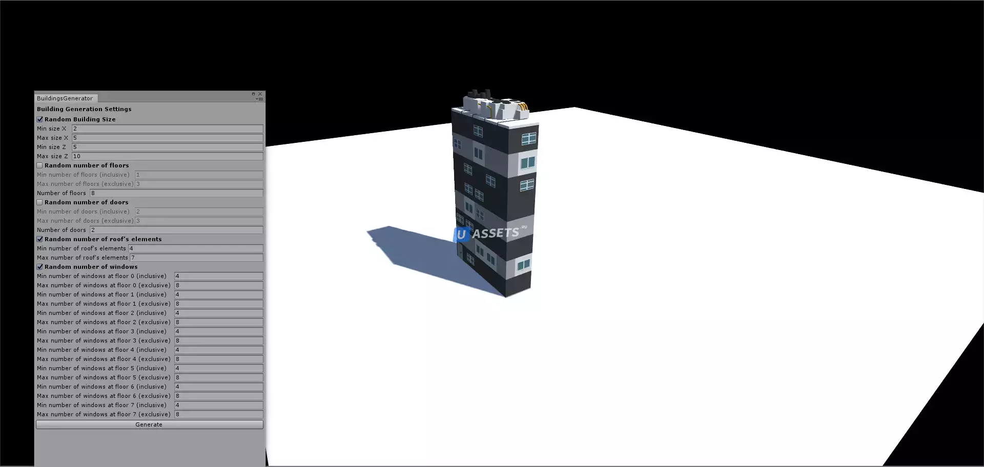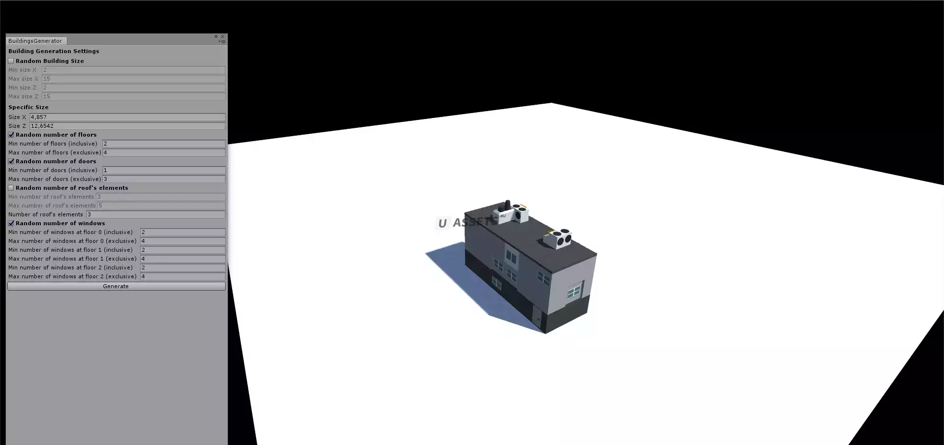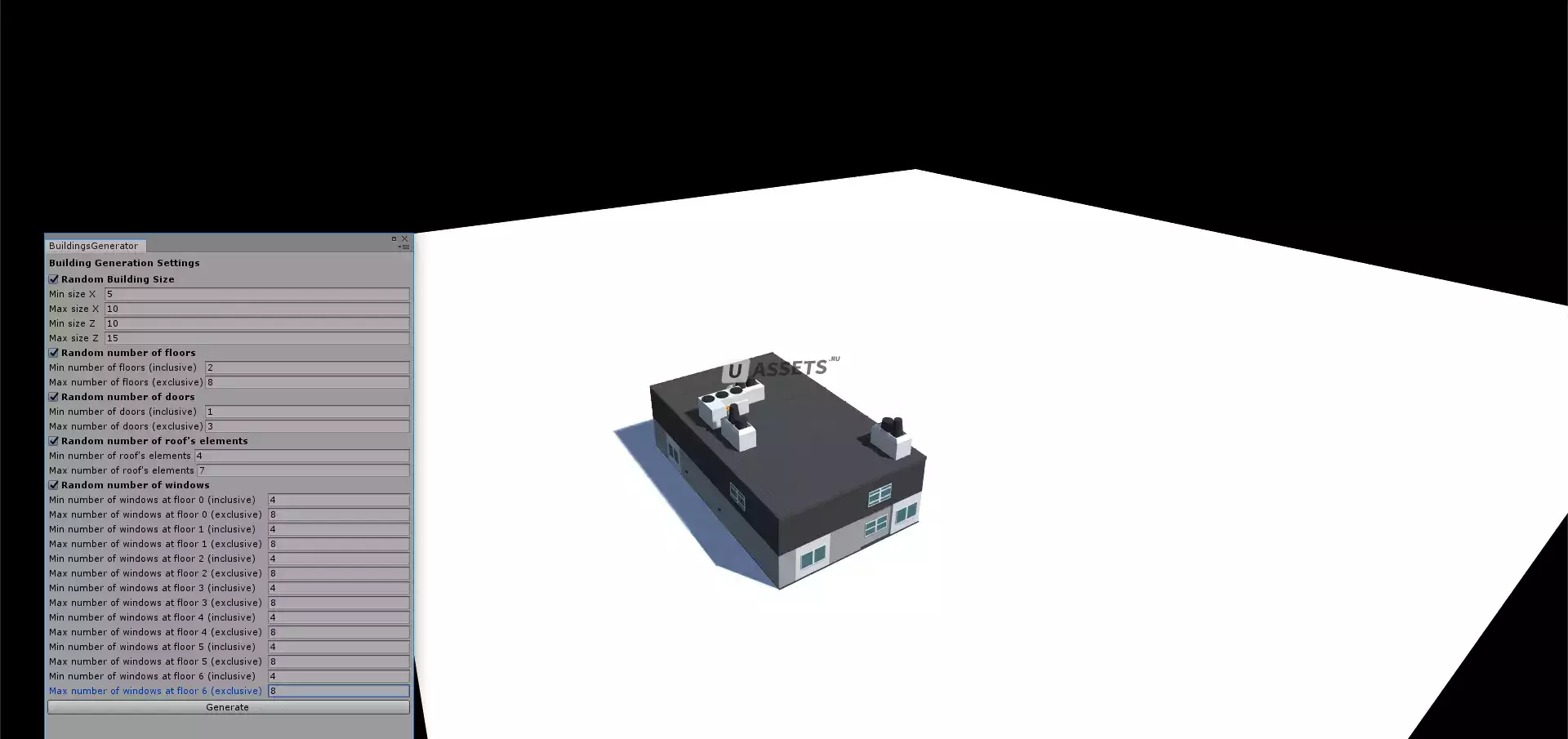 Вы можете задать определенное значение или диапазон для случайного значения размера, количества этажей, количества дверей, количества элементов на крыше, количества окон ... и просто нажать кнопку, чтобы процедурно сгенерировать здание! Если вам нравится сгенерированное здание, вы можете просто нажать другую кнопку, чтобы сохранить его в качестве сборного в активах!