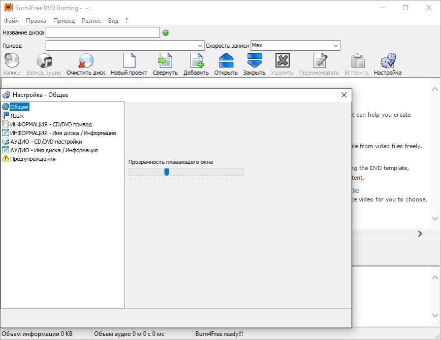 С помощью Burn4Free вы также сможете создавать и аудио-диски, что касается аудио форматов файлов, их список не слишком длинный WAV, FLAC, WavPack, WMA, M3U, MP3, MP2, MP1 OGG, и CDA, но этого вполне достаточно для домашних условий.