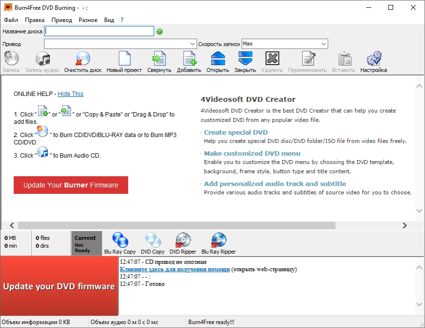 Burn4Free - это бесплатное приложение для компьютера, предназначенное для мгновенной записи и копирования CD/DVD/Blue Ray дисков, обладает простым мультиязычным интерфейсом, рассчитанным на обычных пользователей.