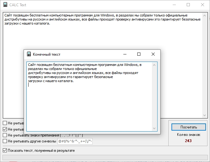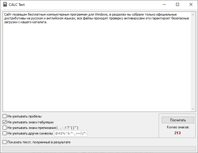 CALC Text – небольшая размером всего в 383 кб бесплатная программа калькулятор для подсчета количества символов в тексте. Программа не требует установки в систему и успешно запускается с портативных переносных накопителей, например, с USB флешки, работает в среде под управлением операционной системы