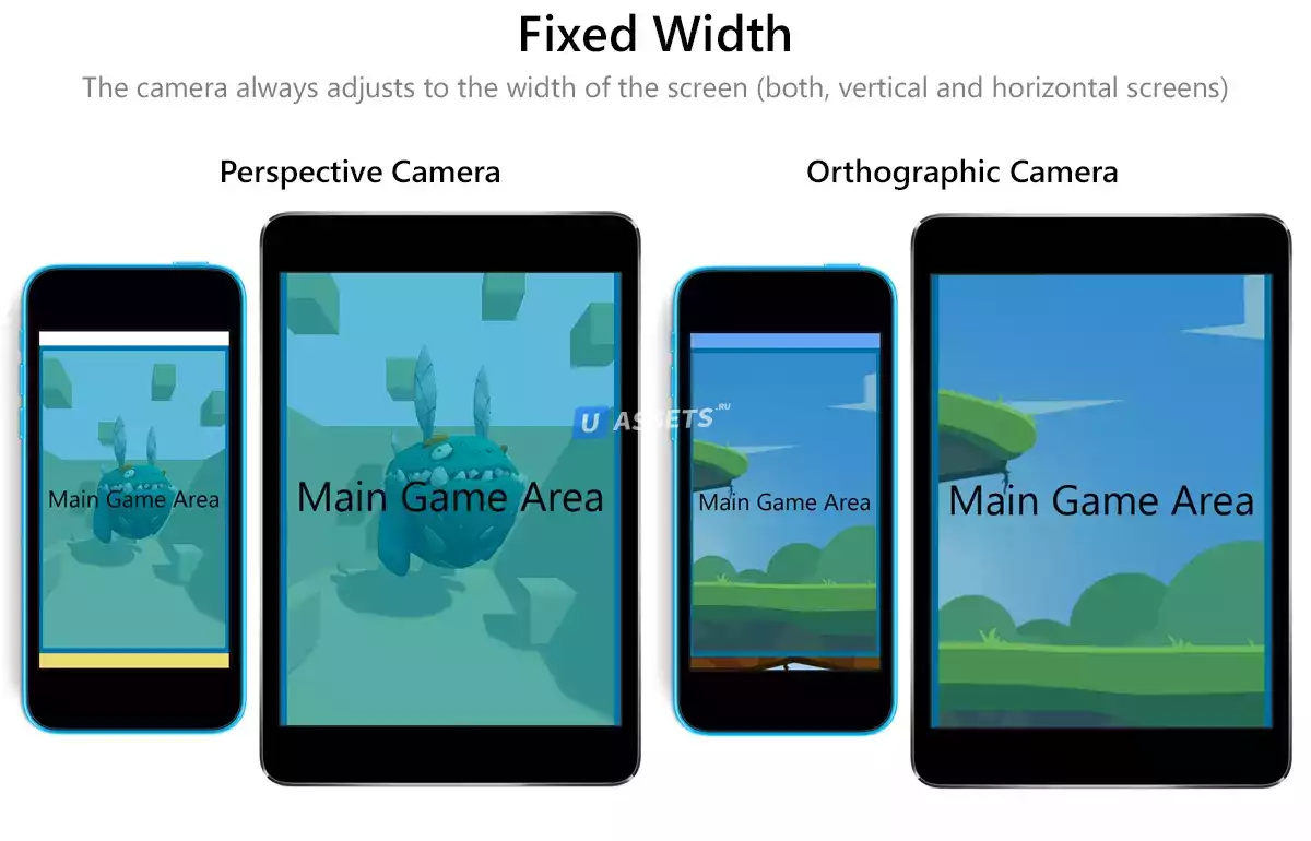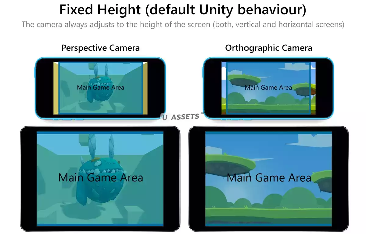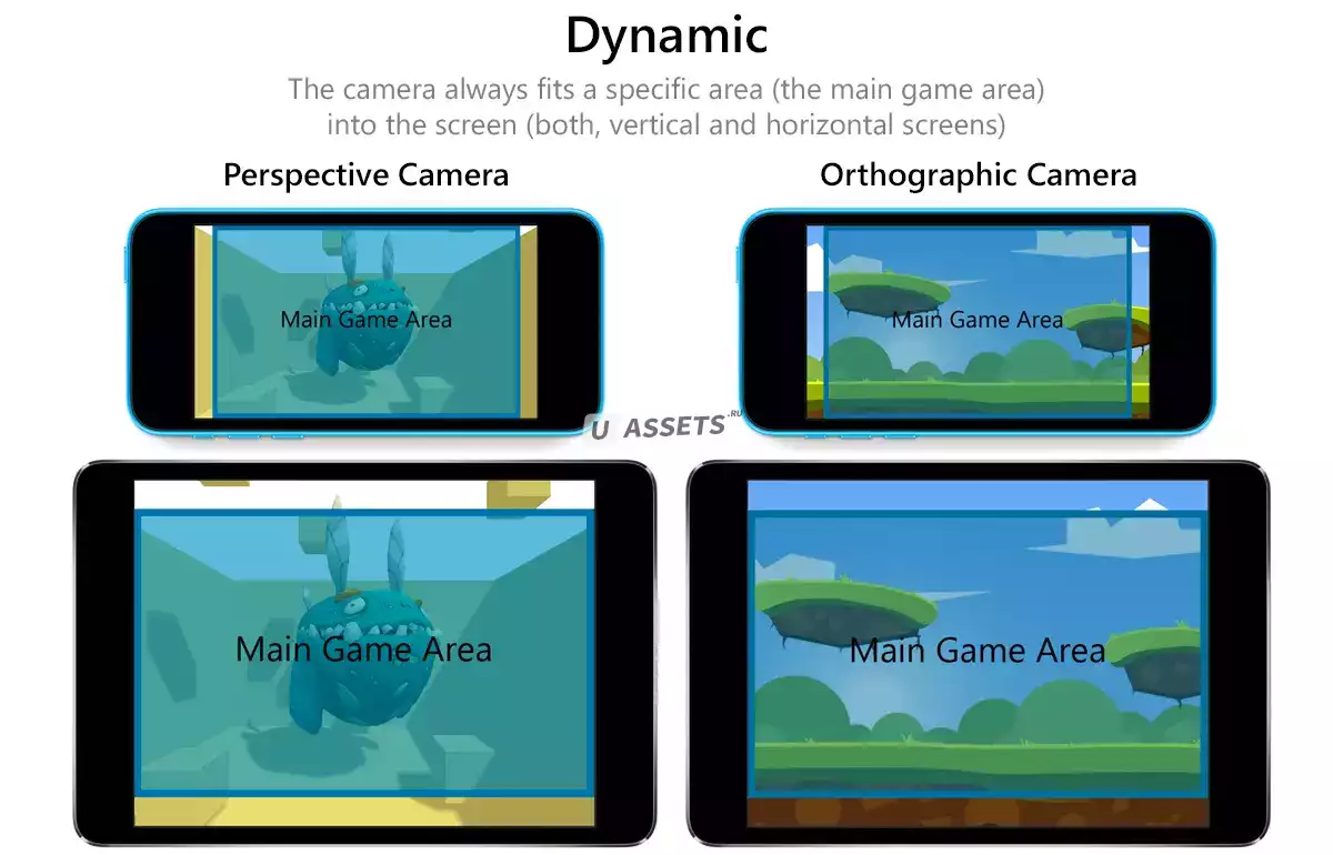 В динамическом режиме указанная область (основная игровая область) всегда будет видна, независимо от того, какой размер экрана / окна вы выберете - компонент Camera Fit отрегулирует усеченную форму, чтобы эта область всегда оставалась на экране.