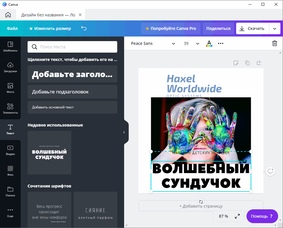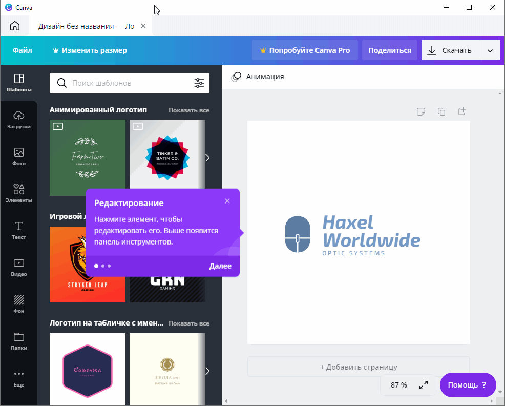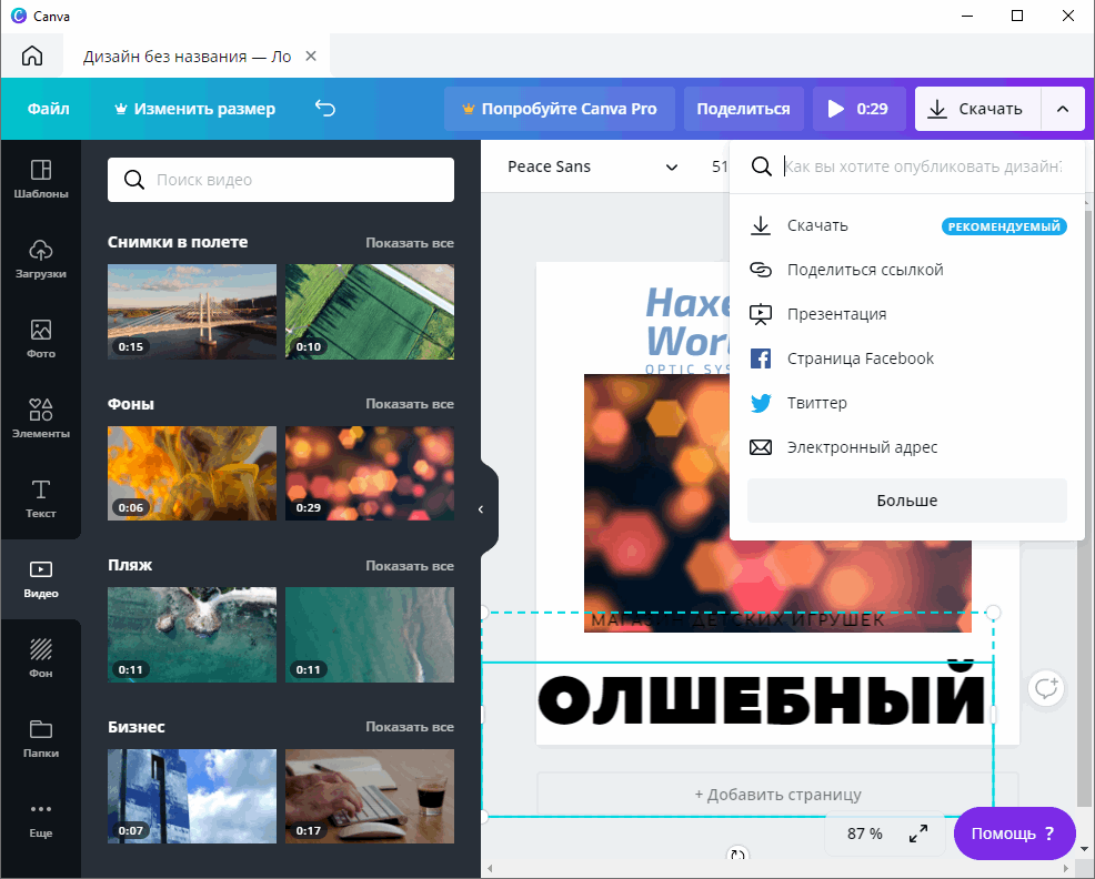 Canva предлагает десятки тысяч шаблонов плакатов, брошюр, визитных карточек, логотипов, презентаций, рекламных баннеров и т.д. В оформлении можно использовать собственные материалы, загруженные с компьютера или из подключенных к профилю облачных файлохранилищ. Готовые дизайны можно сохранять в форматах JPG, PNG, PDF, GIF и MP4 для видео.