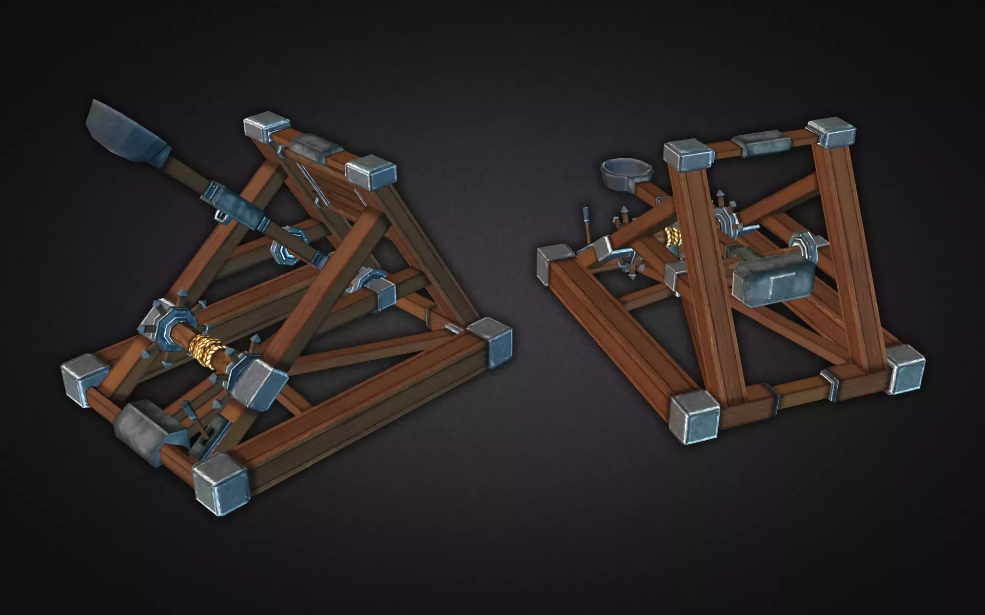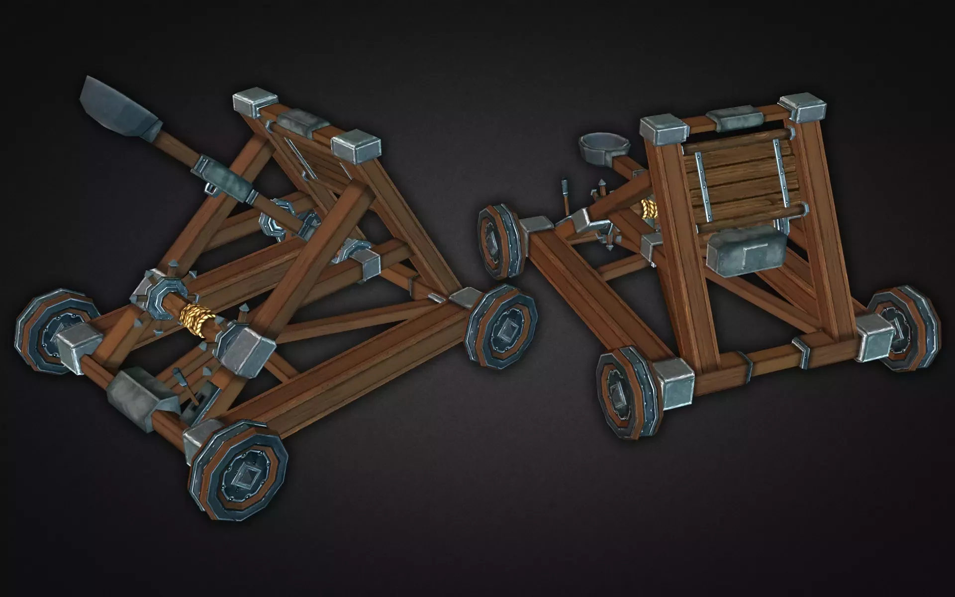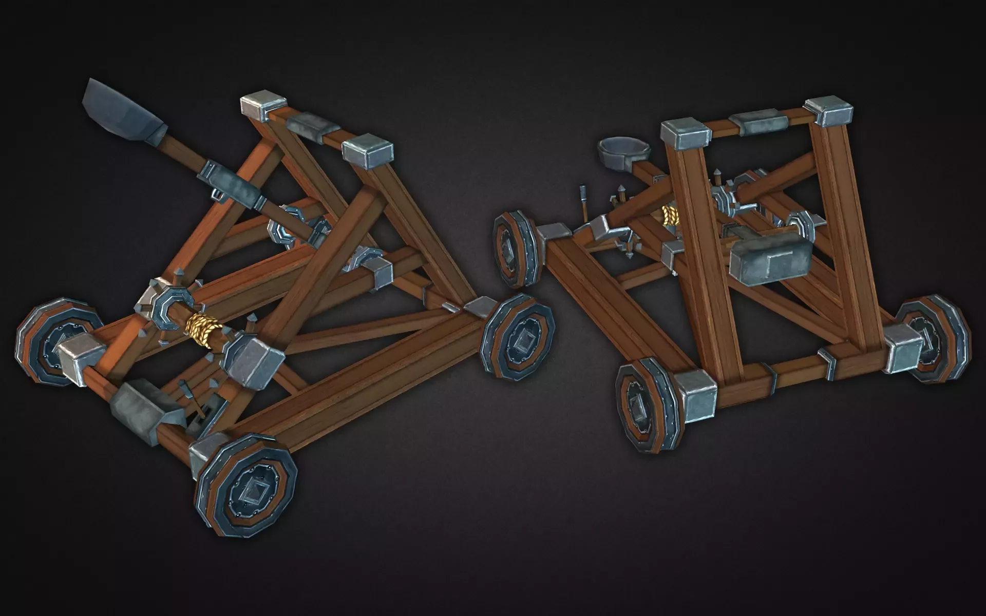 Очень детализированные средневековые катапульты. Отлично подходит для таких жанров игр, как Tower Defense, mmorpg, стратегии и т.д. Колеса на пушке можно поворачивать по отдельности, так что вы можете легко анимировать ее. то же самое с рычагом метателя, все шарниры установлены.