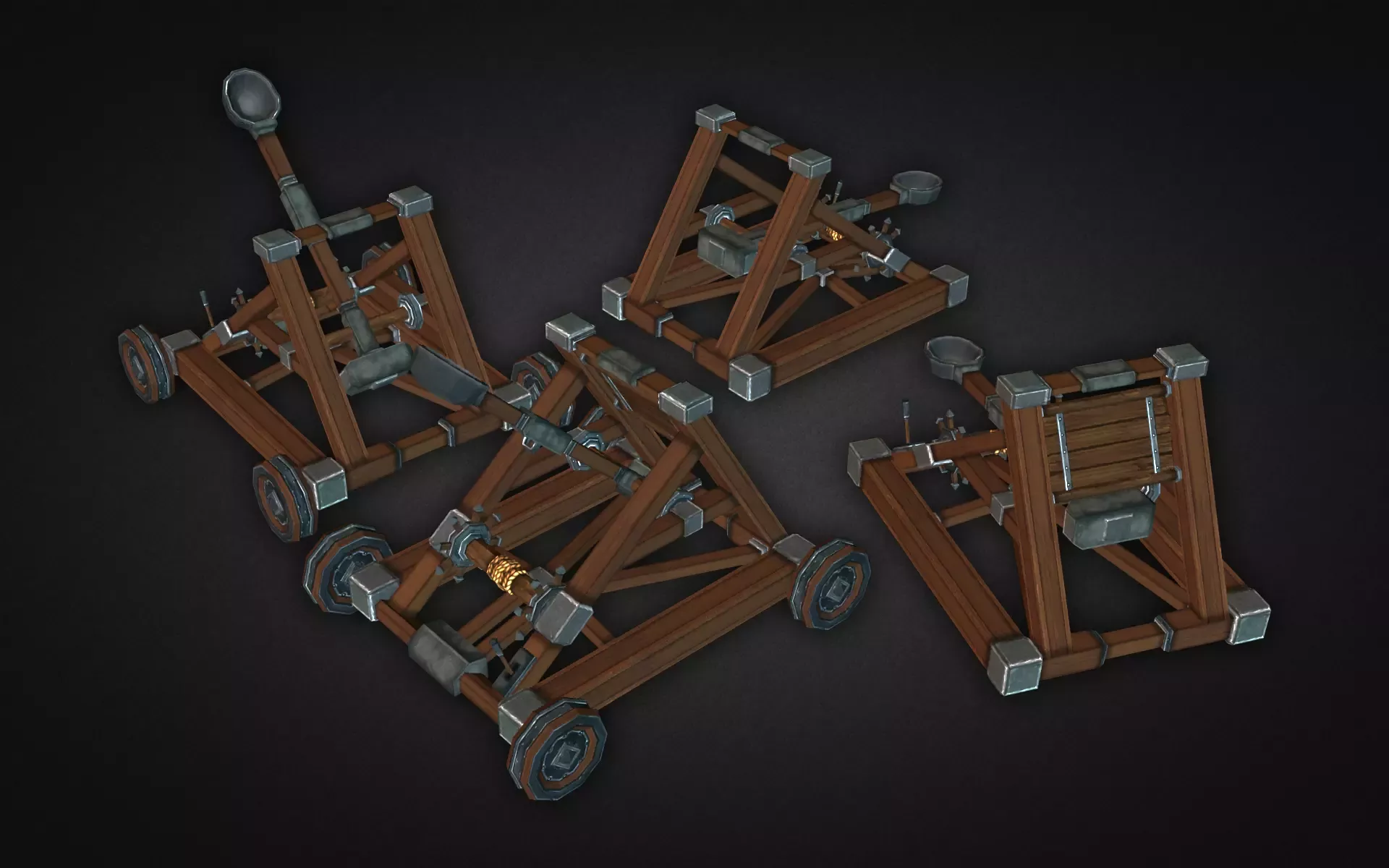 В комплект входит четыре типа катапульт: катапульта на колесах и для твердой земли, и оба типа с дополнительной броней для защиты от стрел и т.д.