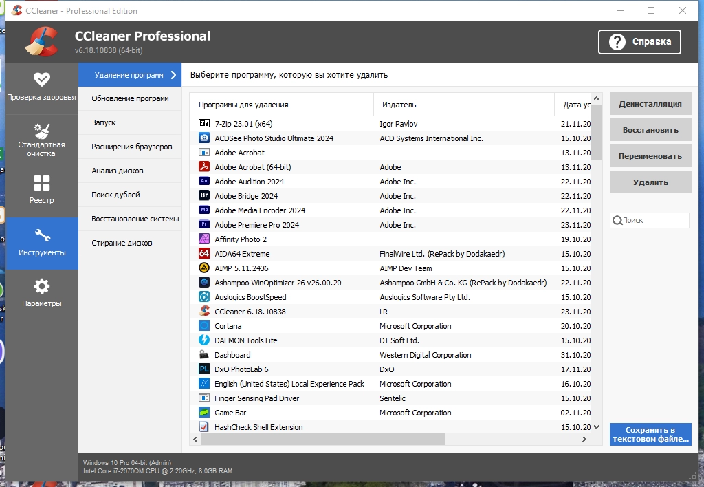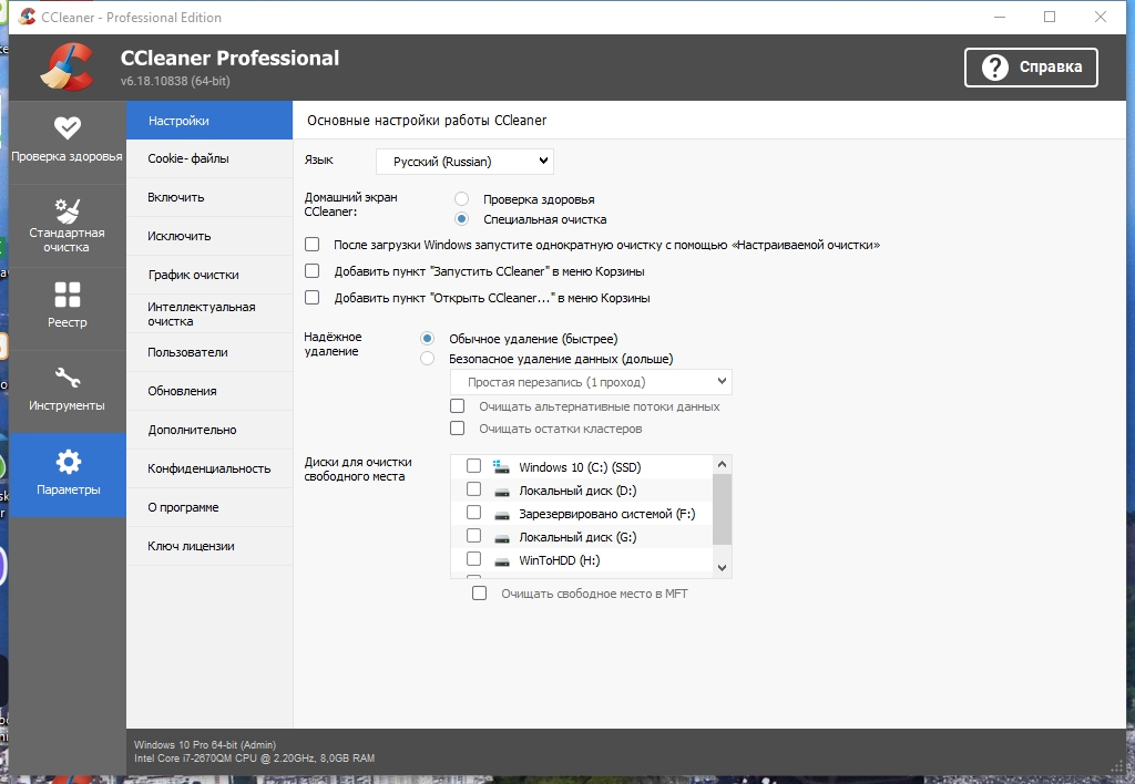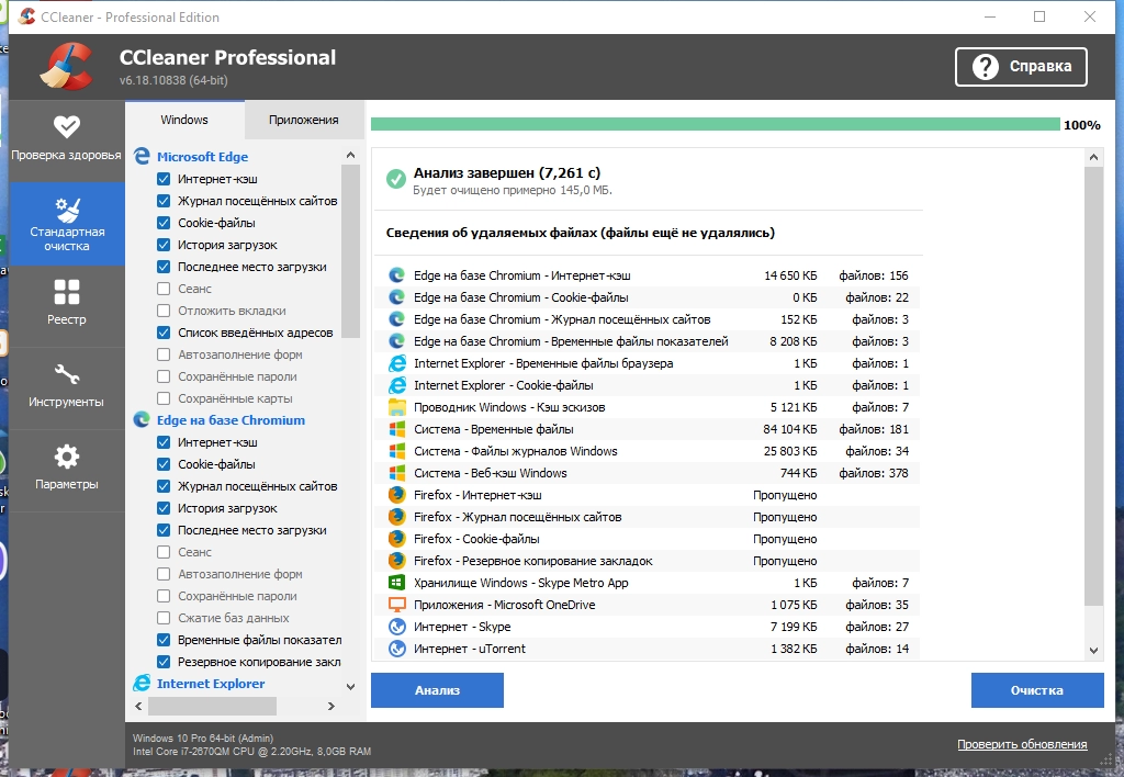 Основная задача CCleaner 6.18.10838 — комплексная очистка следов деятельности пользователя и приложений. Утилита работает с широким спектром данных, включая историю браузеров, cookies, временные интернет-файлы, содержимое корзины, журналы Windows и списки последних документов. Поддерживается очистка временных файлов множества сторонних программ, таких как медиаплееры, офисные пакеты, архиваторы и клиенты для загрузки файлов.
