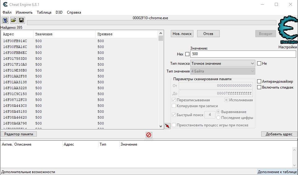 Cheat Engine - продвинутый инструмент, предназначенный в основном для геймеров и позволяющий изменять значение в играх, например количество жизней персонажа. Программа позволяет перехватывать значение в оперативной памяти, и отсеивать по определенным алгоритмам, к примеру если вы введете число 100, программа найдет вам сотни совпадений, но если изменить это значение в игре, и повторить поиск, то результаты значительно сократятся, и таким образом повторяя циклически отсевы вы найдете именно то значение которое вам и требовалось.