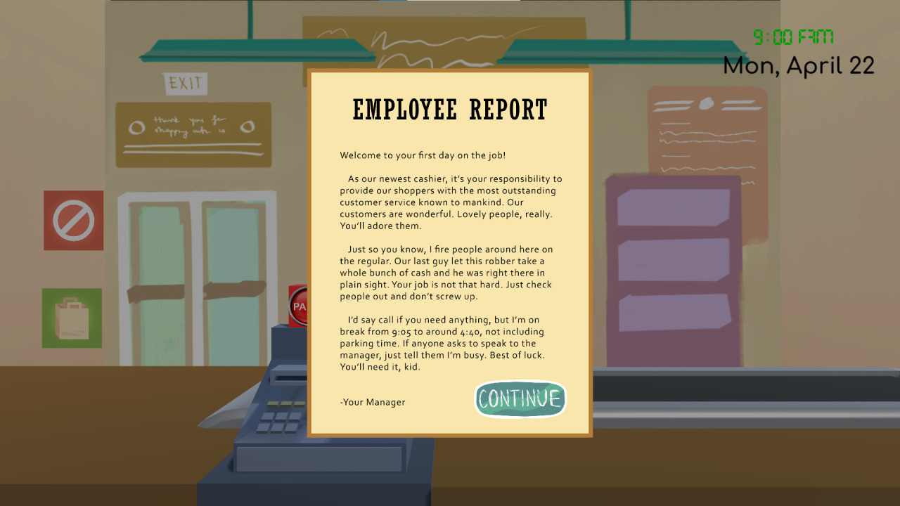 В игре Check it Out! обязанности не ограничиваются простым пробиванием чеков. Значительная часть геймплея связана с необходимостью проявлять бдительность, чтобы предотвратить возможные ограбления, что требует быстрой реакции на угрозы. Также важно тщательно проверять товары, не допуская продажи испорченных или просроченных продуктов. Кроме того, вам предстоит вникать в непростые личные истории клиентов, выстраивая с ними отношения, и постоянно помнить о риске увольнения из-за допущенных ошибок.