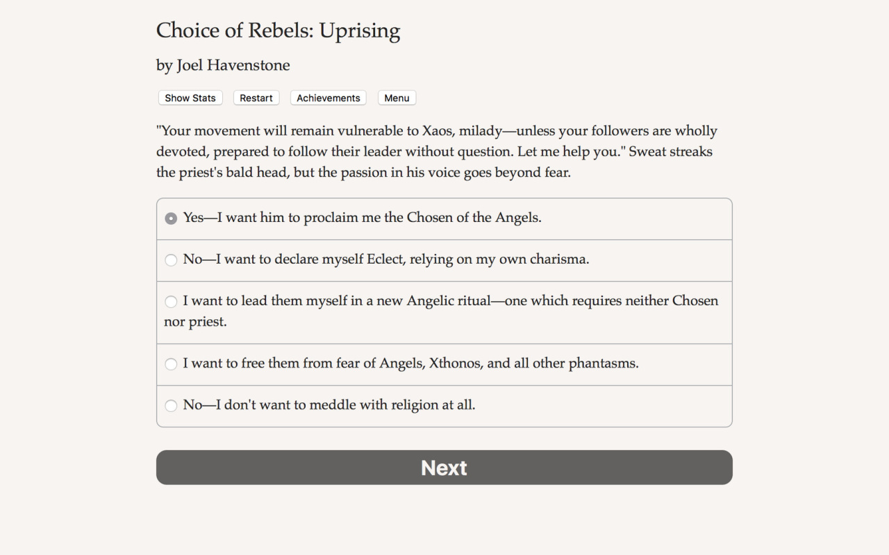 Сюжет в Choice of Rebels: Uprising полностью управляется действиями игрока. Для продвижения требуется вербовать сторонников из разных социальных слоёв, включая йоменов, илотов, торговцев и жрецов. Протагониста можно развивать как мага-самоучку, генерала или мистического жреца, выбрав предысторию аристократа-отступника или непокорного раба. Принятые решения определяют, кто станет соратником, а кто — врагом, напрямую определяя дальнейшую судьбу сопротивления в этой интерактивной истории.