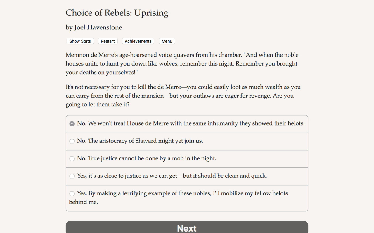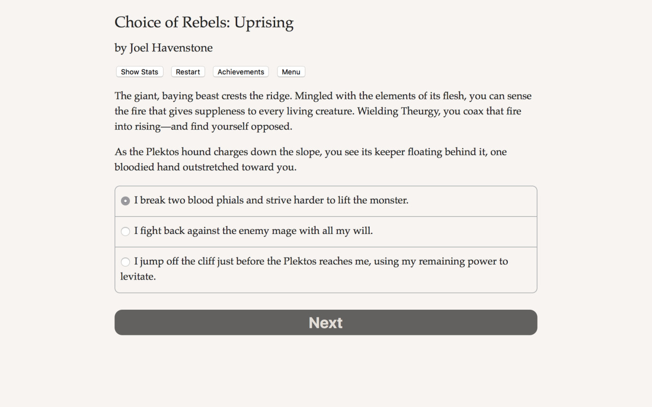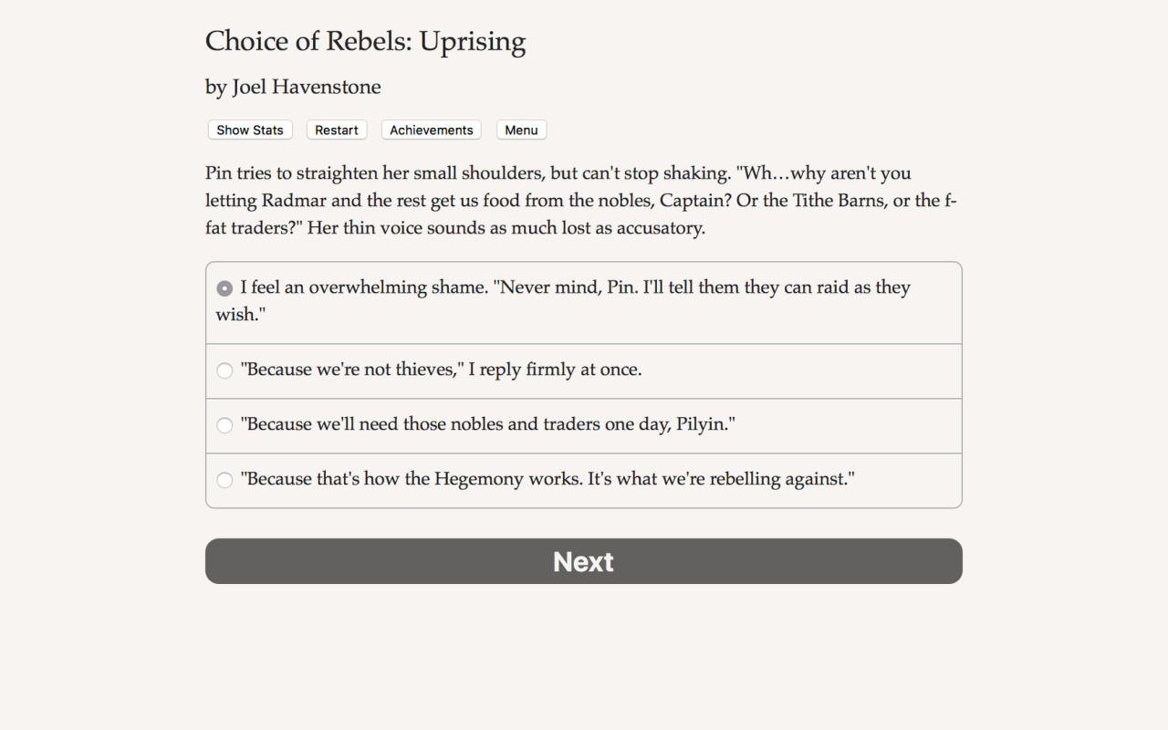 Choice of Rebels: Uprising ставит задачу возглавить бунт против тиранической империи. Геймеру отводится роль предводителя изгнанников, действующих из лесной глуши. Ключевая цель — пережить первую суровую зиму, для чего необходимо добывать ресурсы во избежание голода среди соратников. Основной конфликт строится вокруг превращения небольшой группы в армию, способную покончить с властью Гегемонии, основанной на кровавой магии. Весь геймплей основан на принимаемых решениях, направляющих развитие событий.